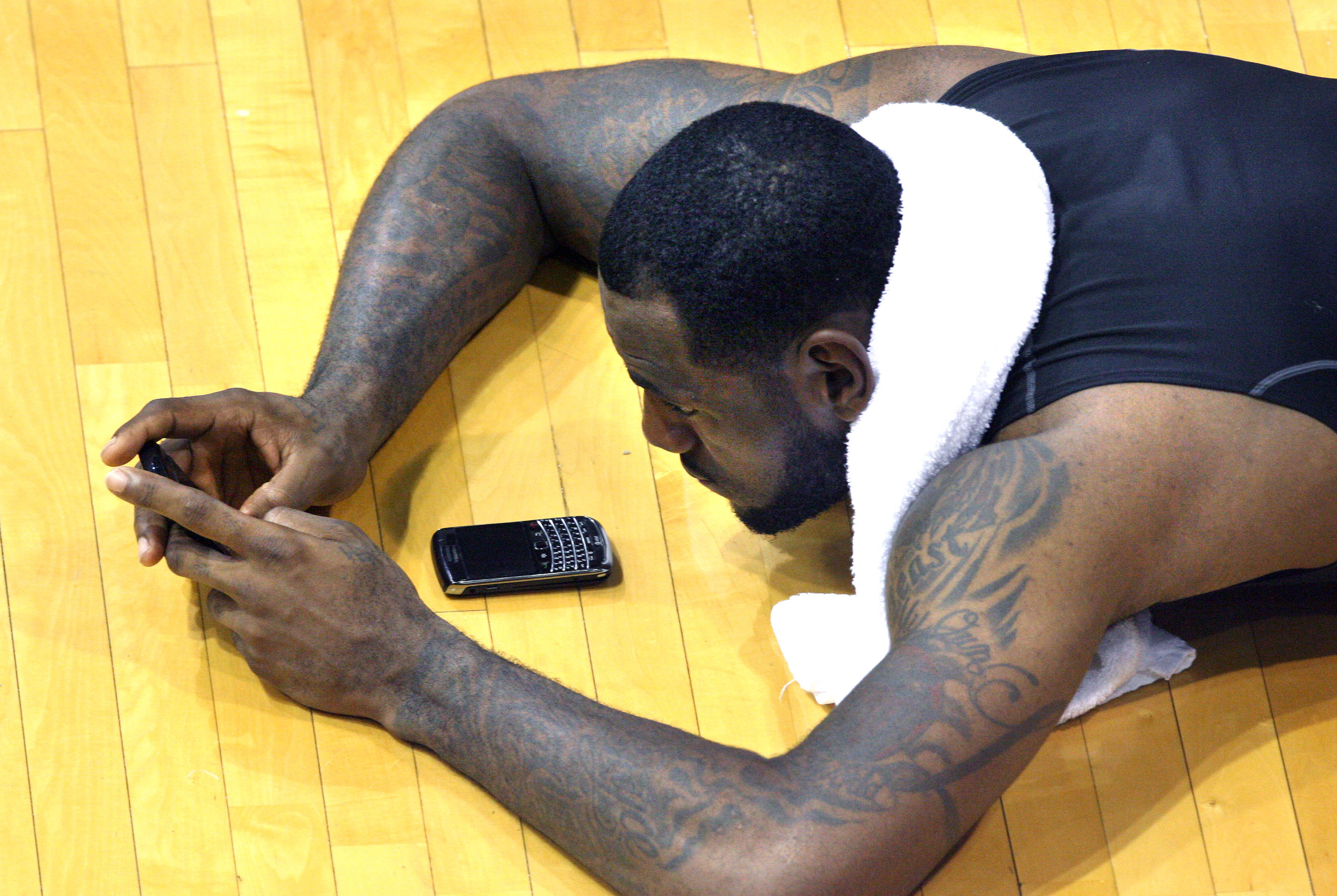 LeBron James works on one of his BlackBerry devices after the evening workout with high school basketball players at his skills academy on Tuesday in Akron, Ohio.
