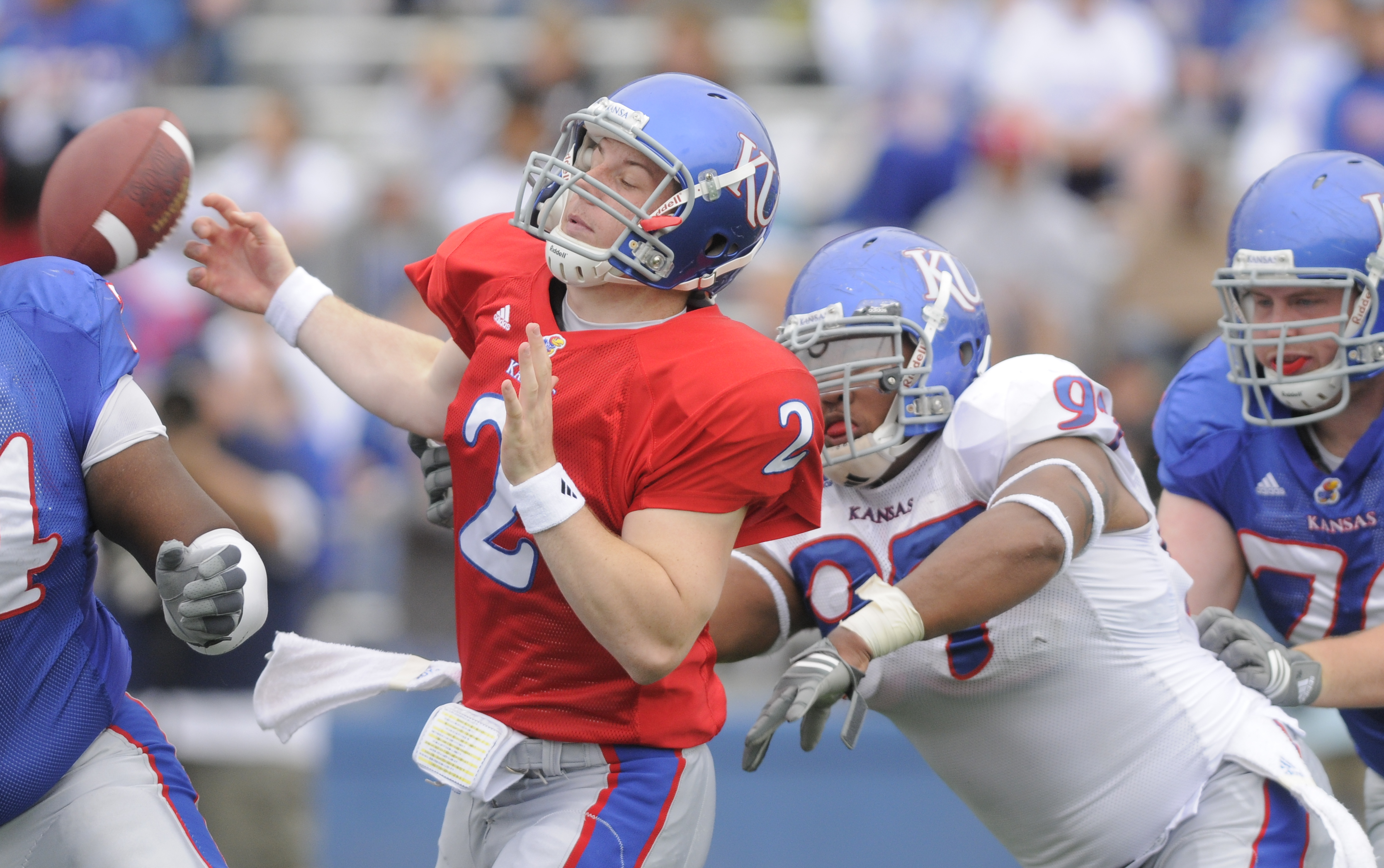 In Laptad’s absence, red-shirt freshman Kevin Young took many of the additional snaps at defensive end. The 6-foot-2, 256-pounder from Olathe tied for the team lead with two sacks in the spring game.
