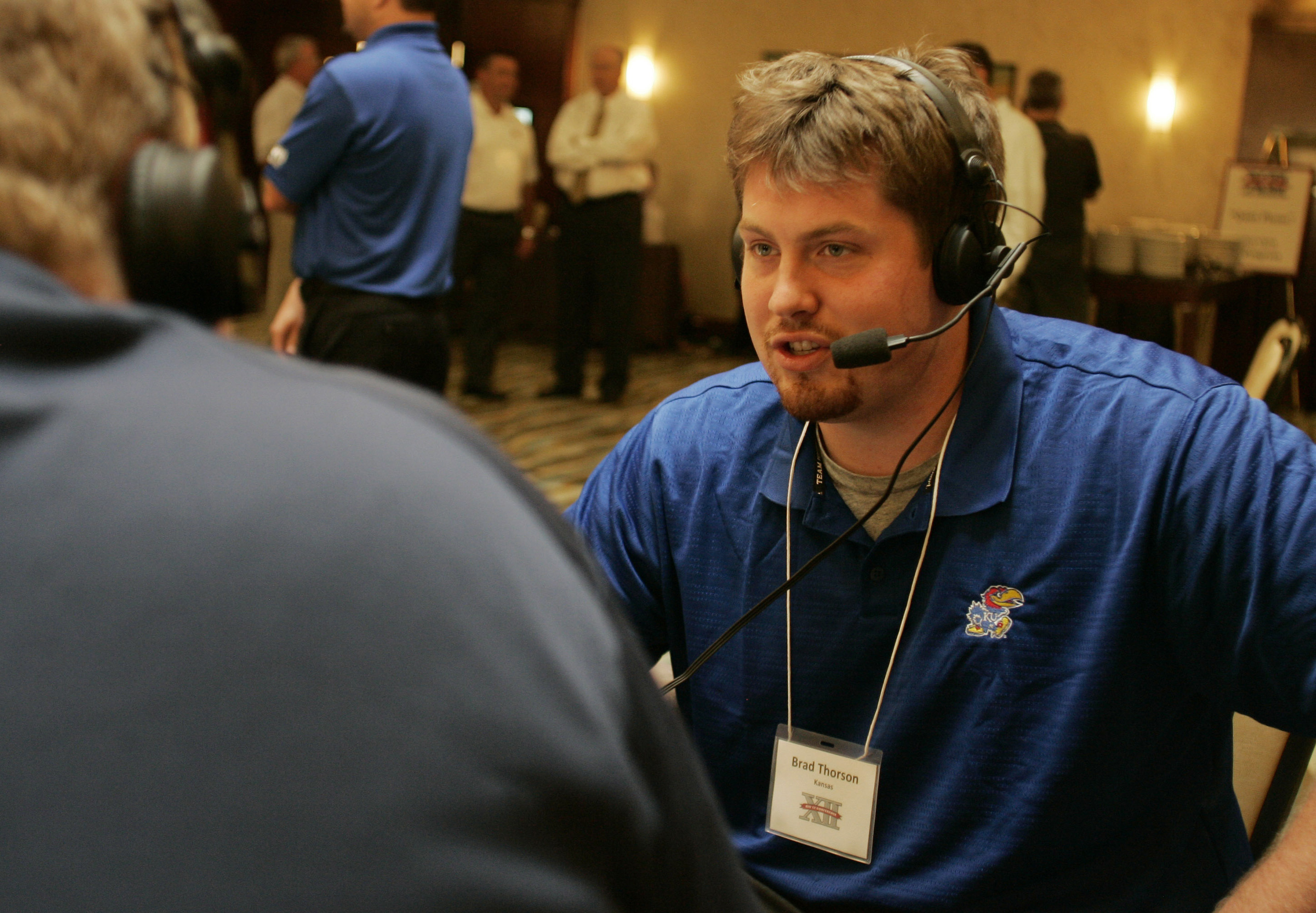 Kansas senior Brad Thorson does an interview on radio row Wednesday at Big 12 media days in Irving, Texas.