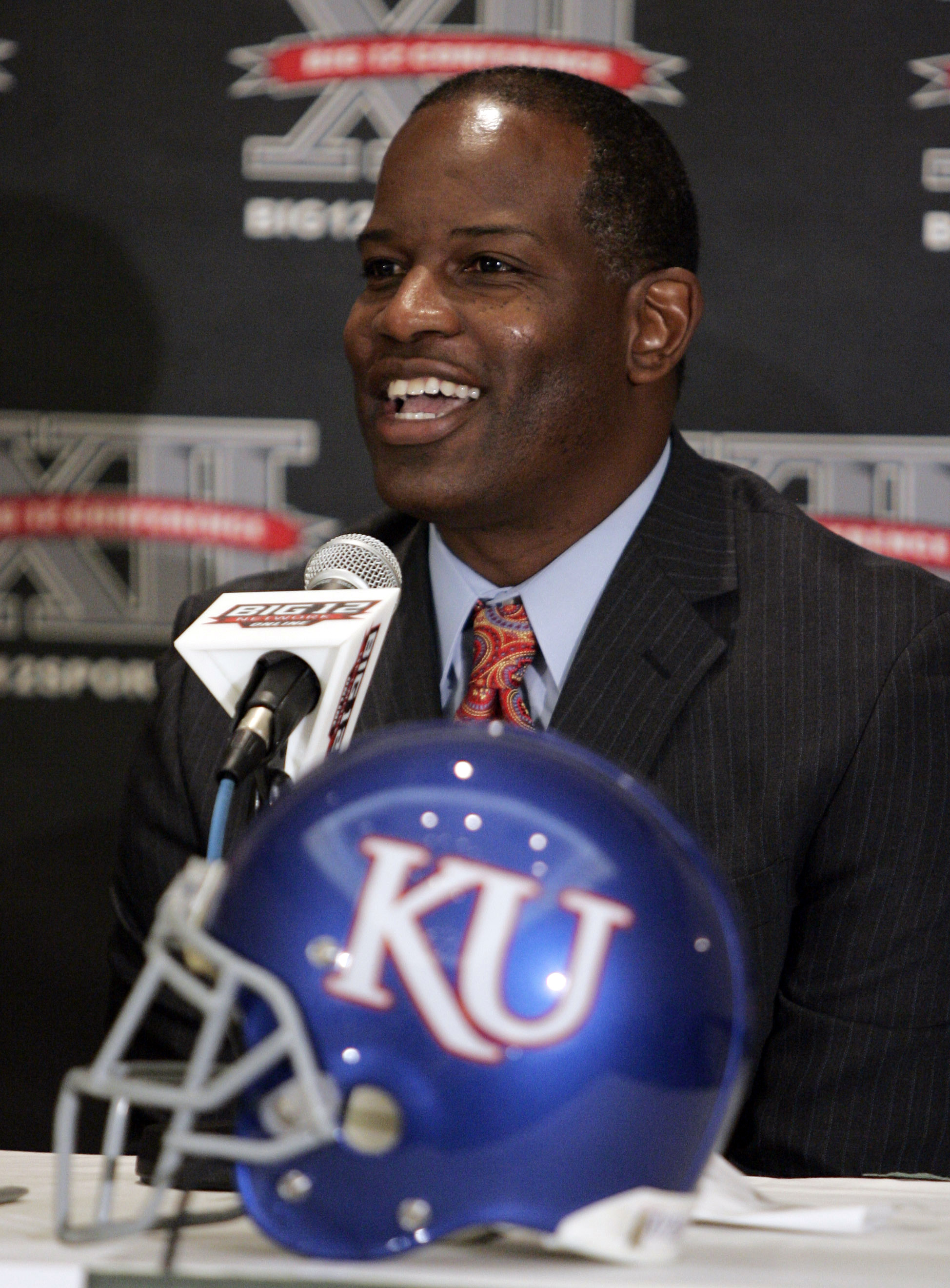 Kansas football coach Turner Gill talks with reporters at Big 12 media days Wednesday in Irving, Texas.