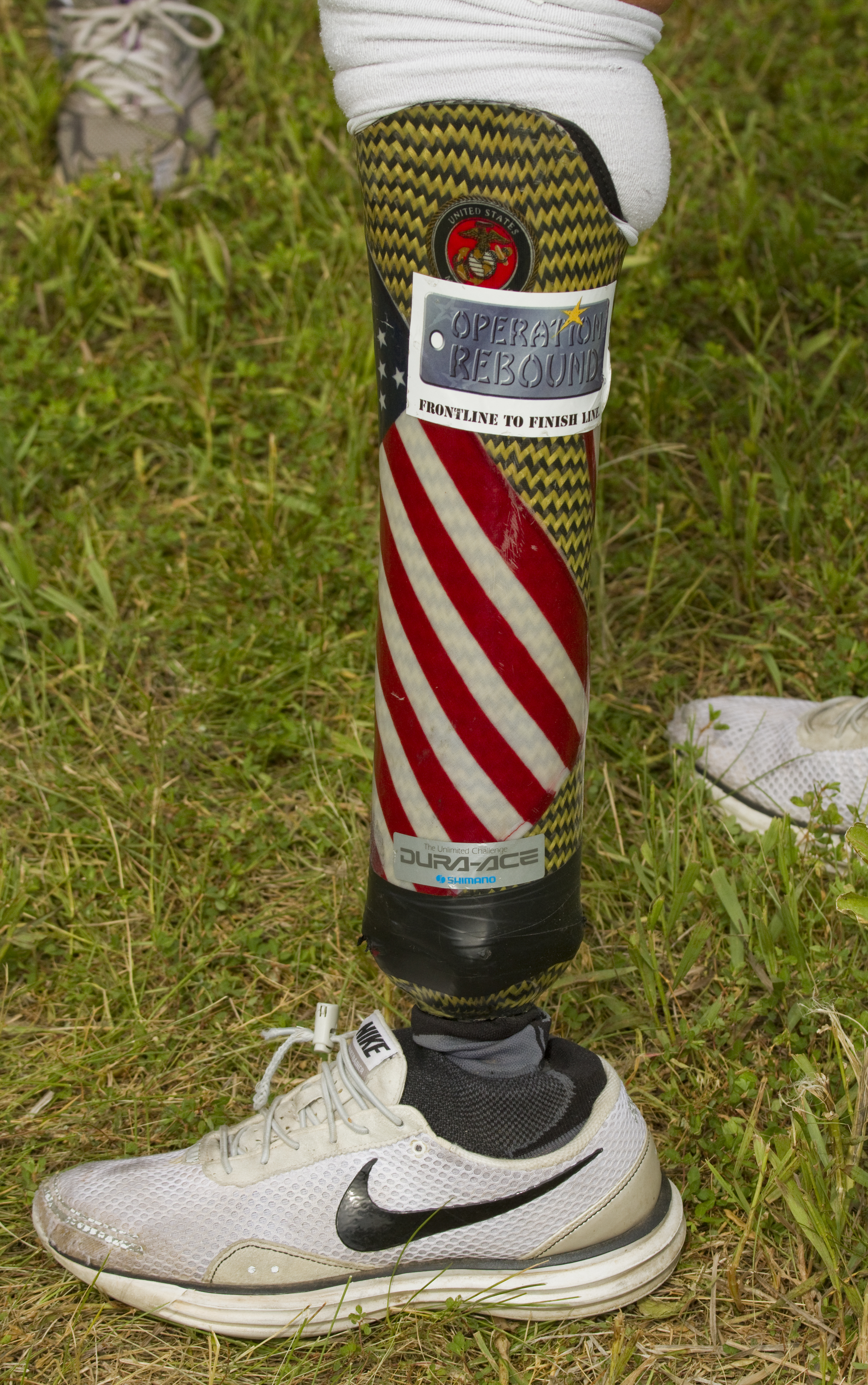 Vietnam veteran Duane Wagner of Arizona will be competing in the bike portion for team Operation Rebound in the Kansas Ironman event at Clinton Lake. The double amputee proudly wears his colors on his prosthetic legs.