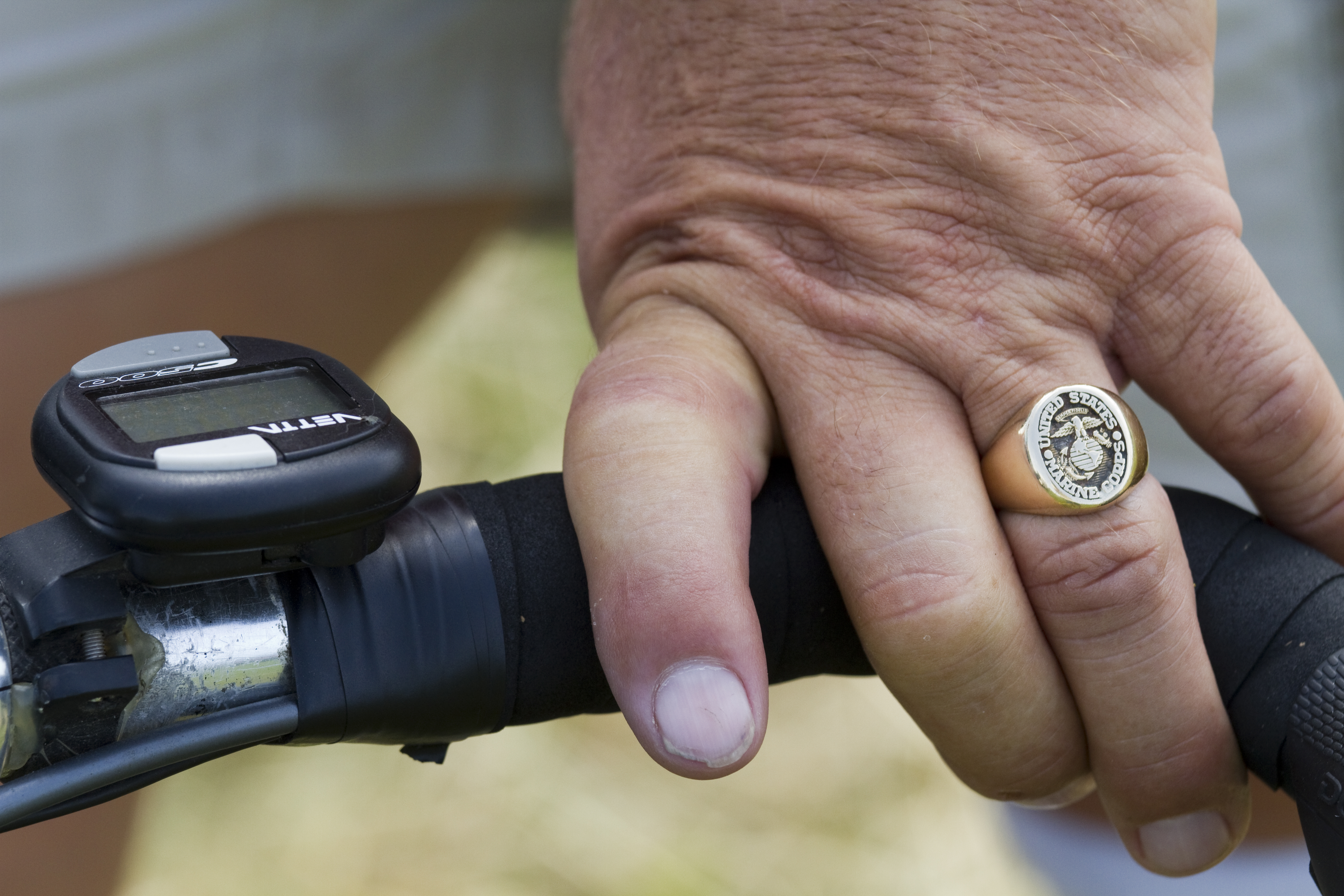 Vietnam veteran Duane Wagner of Arizona will be competing in the bike portion for team Operation Rebound in the Kansas Ironman event at Clinton Lake. Wagner wears his Marine Corps rings while resting on his bike Saturday during registration.