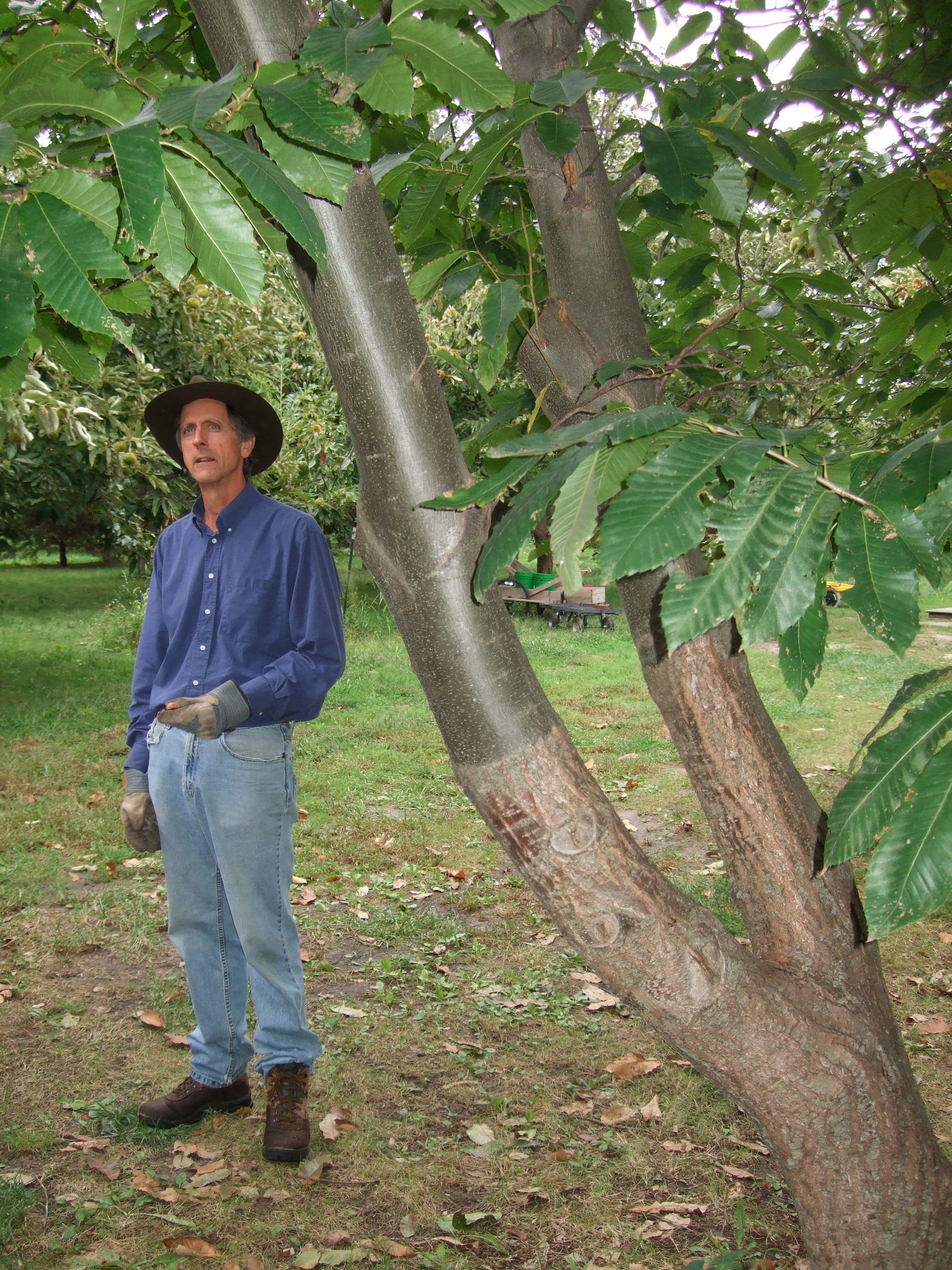 Charlie NovoGradac, of Lawrence, talks about the process of grafting his chestnut trees and shows a visible example during a class at his orchard. Grafting is when a tree with an established root system is cut back and branches from another tree are attached to the old tree with wax. This process allows the new tree to grow more quickly using the old tree’s root systems.