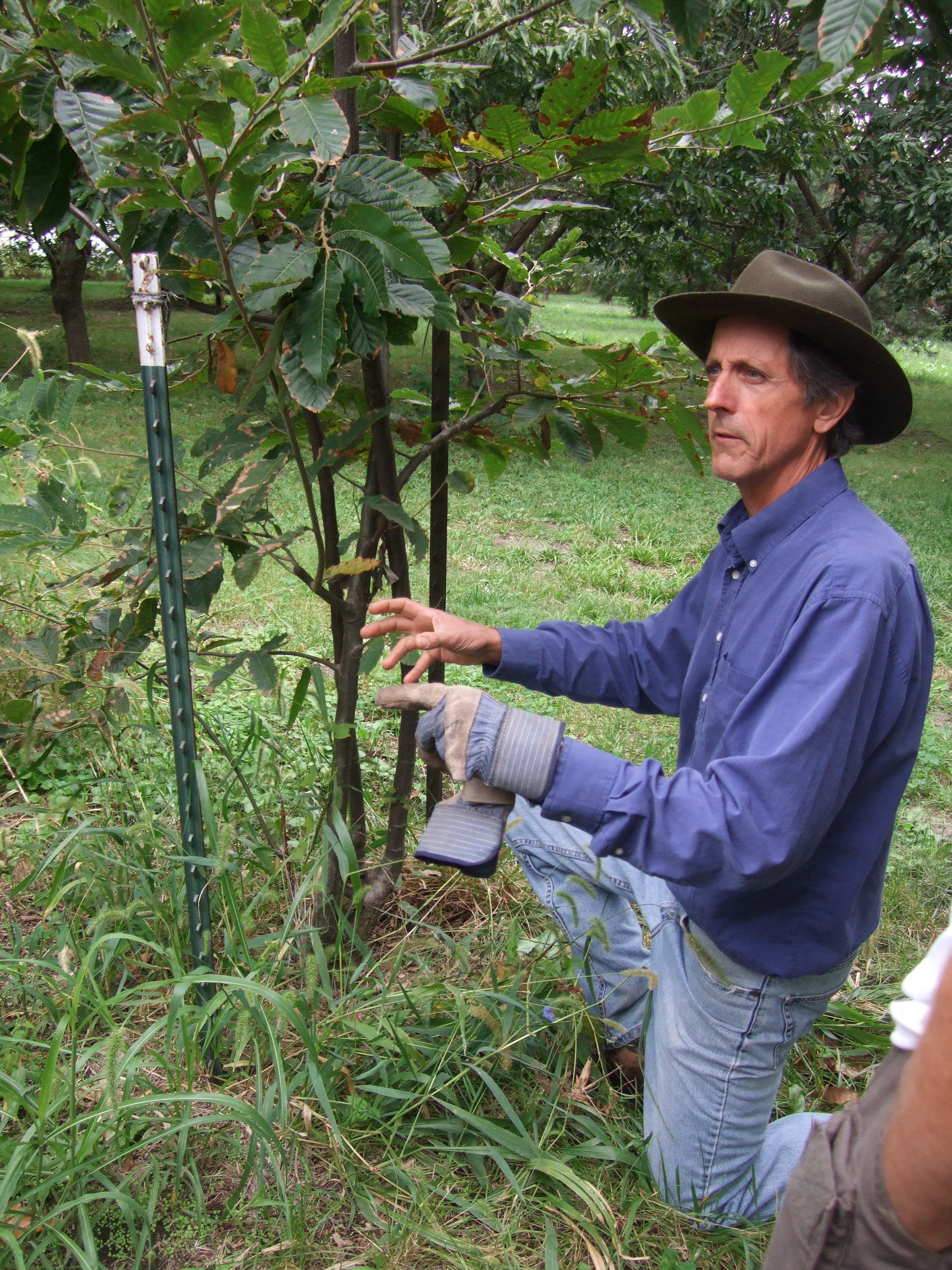 Charlie NovoGradac, of Lawrence, kneels down as he discusses the details of this chestnut tree at his class made possible by the Kaw Permaculture Collaborative’s grant from the USDA.