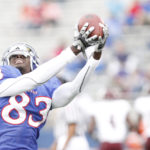 Kansas receiver Chris Omigie pulls in a pass during warmups prior to kickoff against Texas A&M on Saturday, Oct. 23, 2010 outside Memorial Stadium.