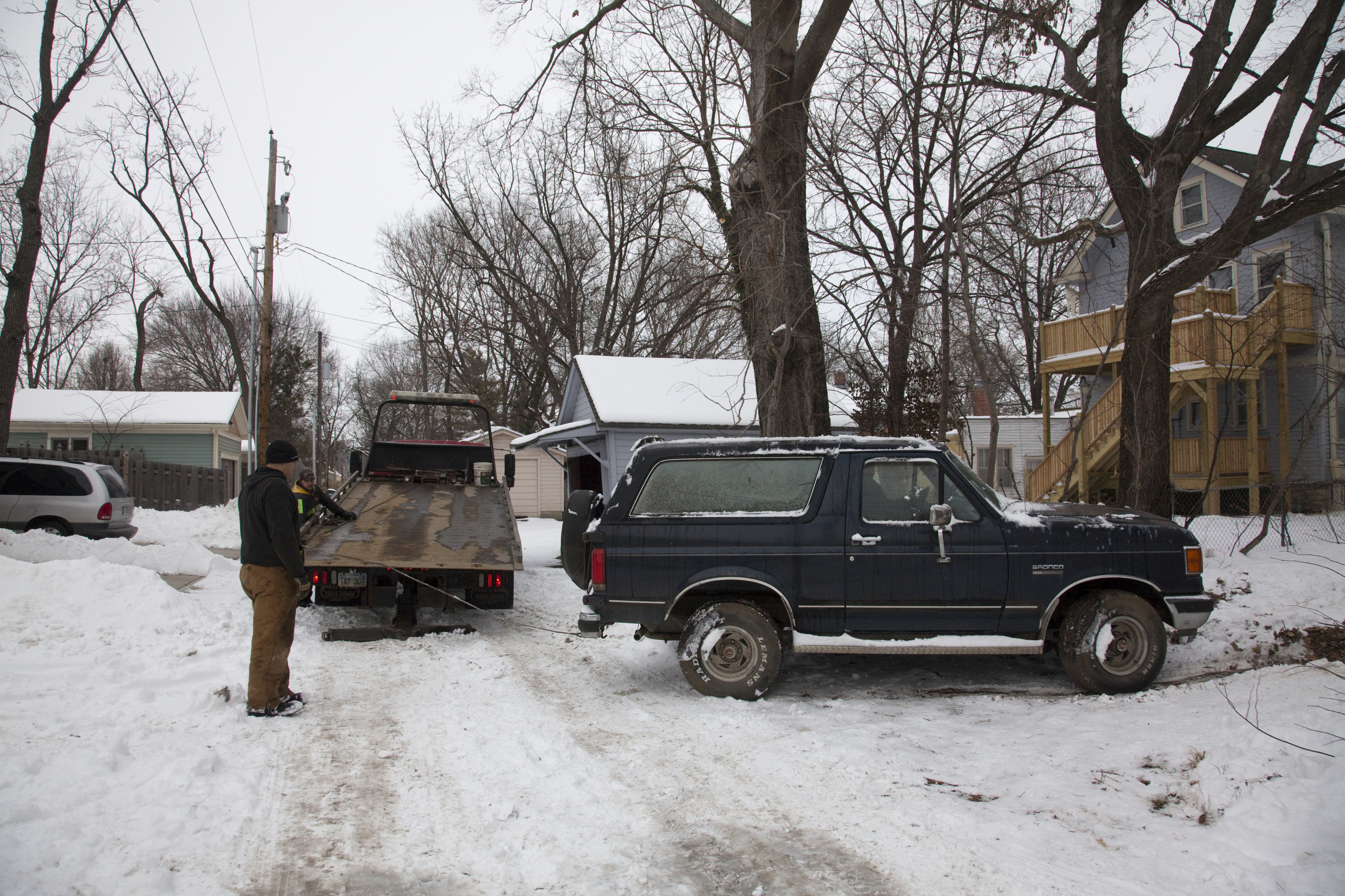 Tow crews begin to load a late-model Ford Bronco after the body of a 58-year-old Lawrence woman was found inside Saturday morning parked behind a house in the 800 block of Tennessee Street.
