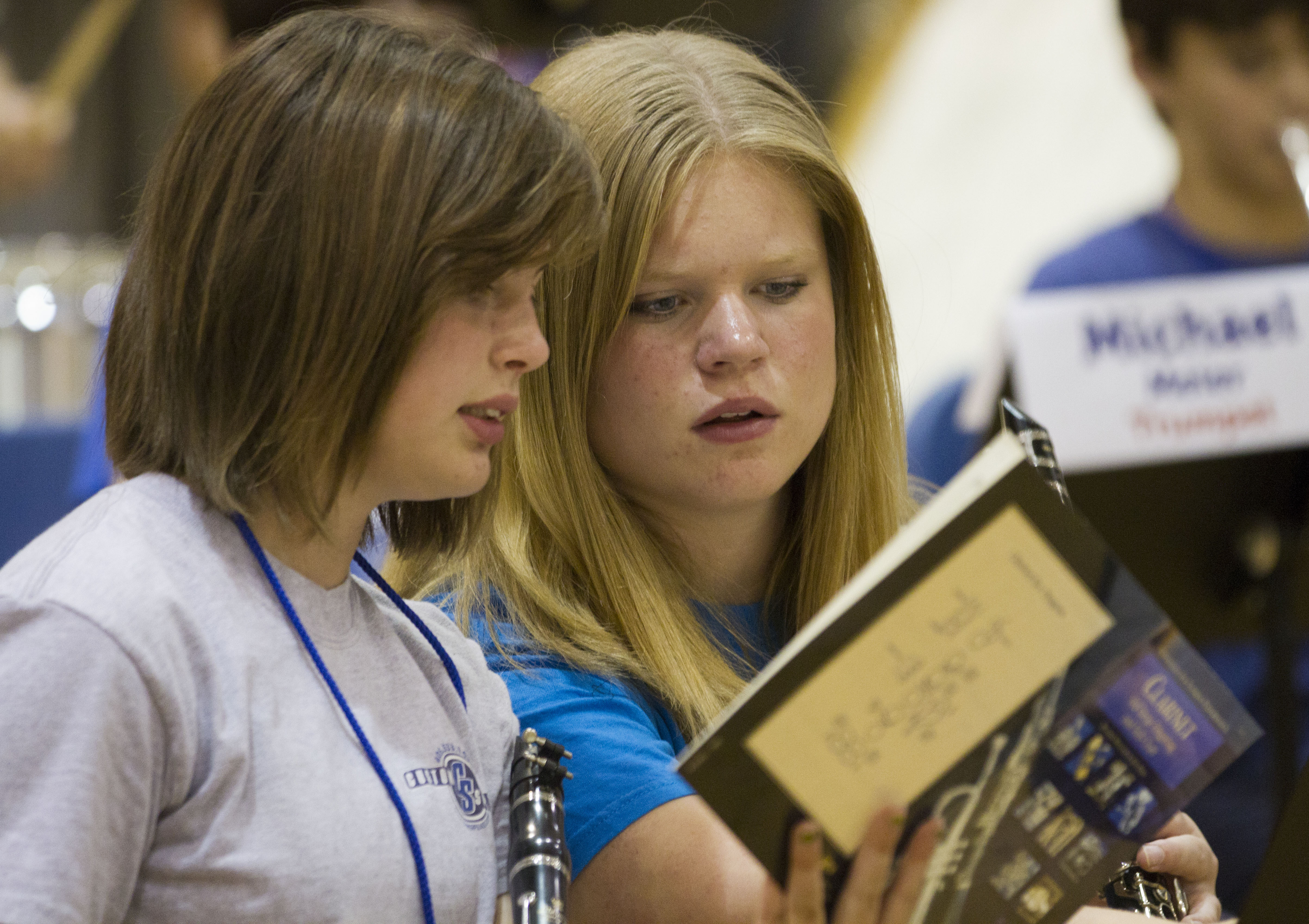 Corrine Yoder-Mulkey, left, and Rachel Opstad look over a book of sheet music during the first rehearsal of the Midwestern Music Academy on Sunday.