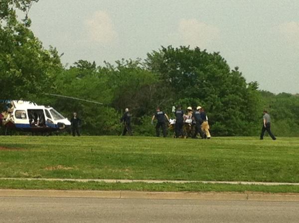 In this photo submitted by Kelly Johnson via Twitter, emergency crews transport the victim of an accidental shooting from an ambulance into a LifeStar helicopter in Dad Perry Park, Wednesday, May 11, 2011.