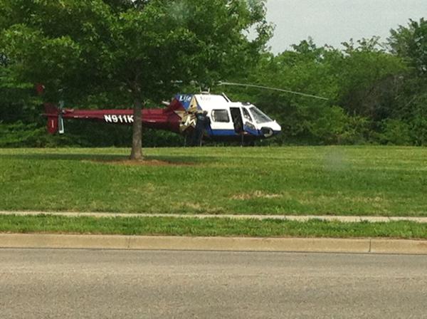 In this photo submitted by Kelly Johnson via Twitter on Wednesday, May 11, 2011, a LifeStar helicopter lands in Dad Perry Park to transport a patient to the hospital after an accidental shooting in the 800 block of Randall Road.