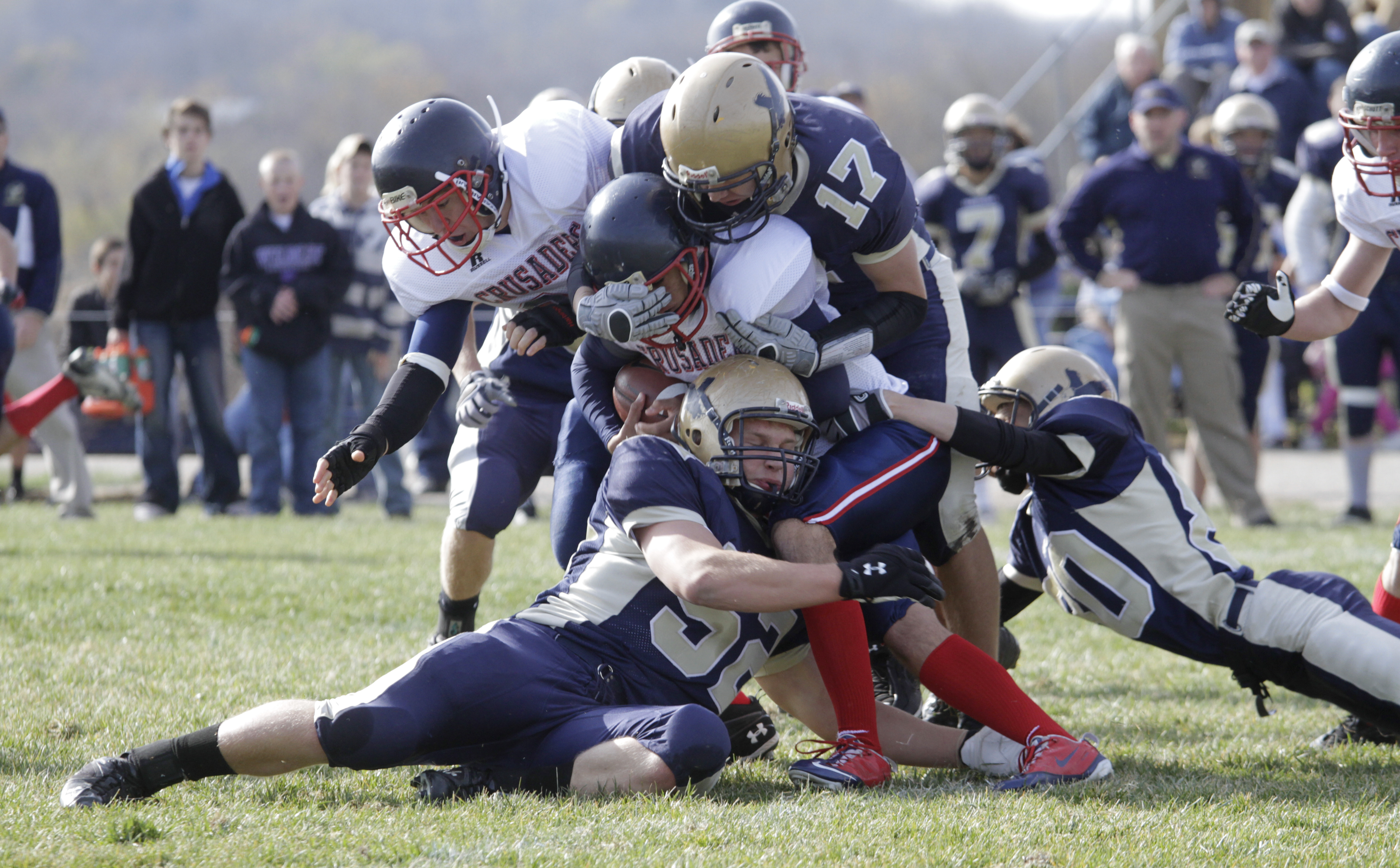Veritas Christian School defenders wrap up the ball carrier during the Eagles playoff game against the St. Mary's Crusaders at Veritas home field in Lawrence Saturday, November 5, 2011. Veritas lost, 48-30.