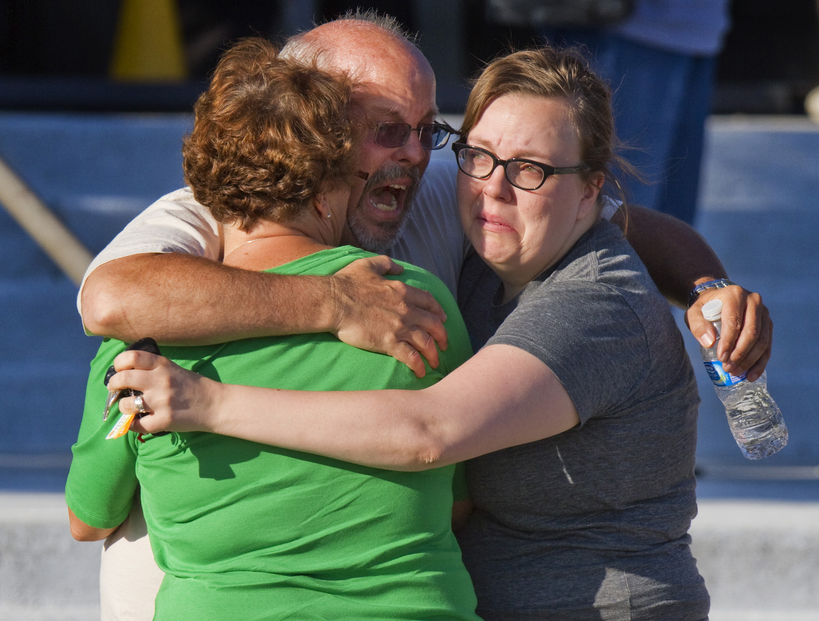 Tom Sullivan, center, embraces family members outside Gateway High School where he has been searching franticly for his son Alex Sullivan who celebrated his 27th birthday by going to see The