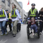 A Boston police officer wheels in injured boy down Boylston Street as medical workers carry an injured runner following an explosion during the 2013 Boston Marathon in Boston, Monday, April 15, 2013. Two explosions shattered the euphoria at the marathon's finish line on Monday, sending authorities out on the course to carry off the injured while the stragglers were rerouted away from the smoking site of the blasts. (AP Photo/Charles Krupa)