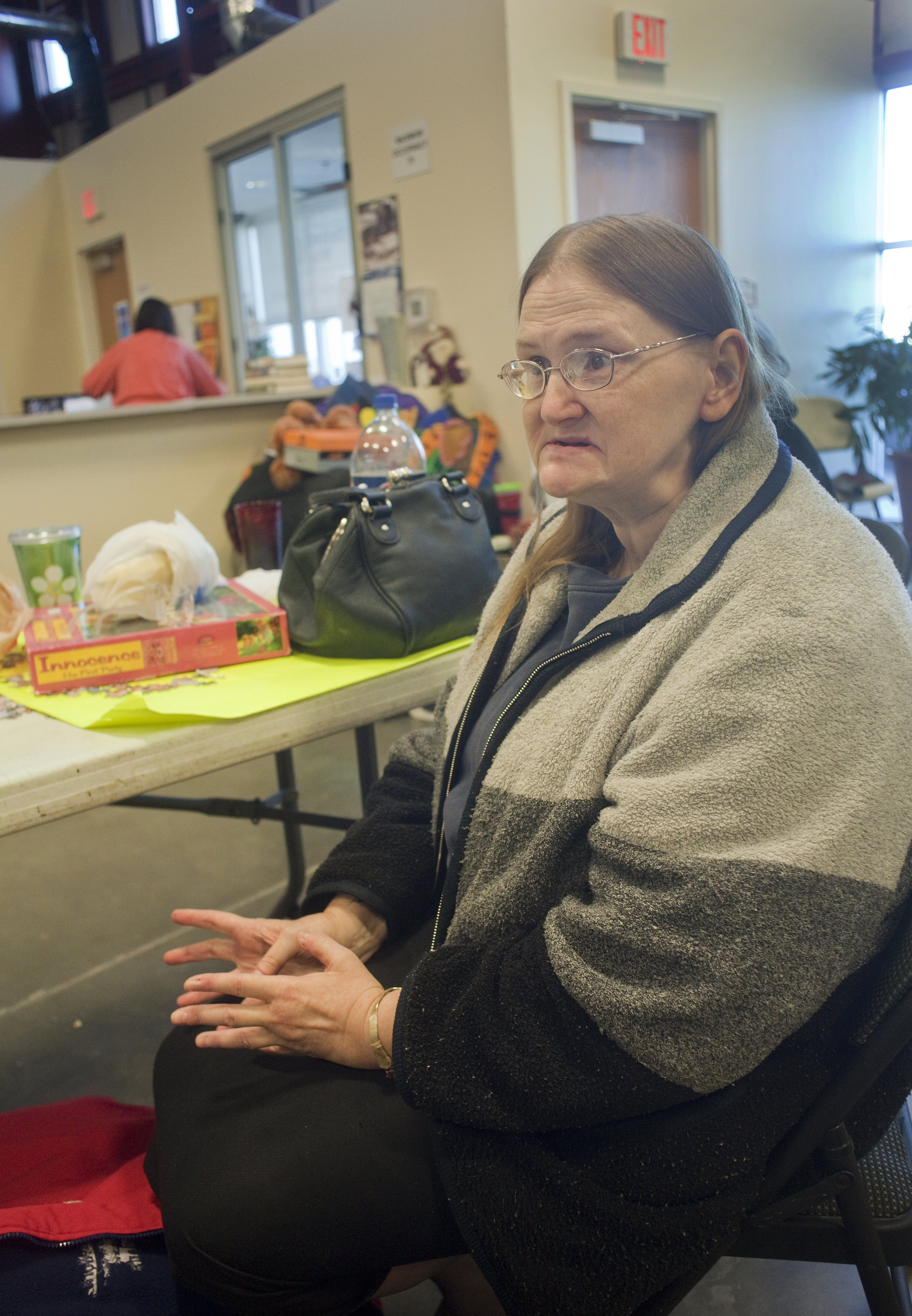 Roxanne Hayden of Lawrence talks about her experience as a guest at both the old and new Lawrence Community Shelter, which opened a year ago this month. Hayden, who just moved into an apartment, took the bus to the new shelter, 3655 E. 25th St., for a recent visit during lunchtime.