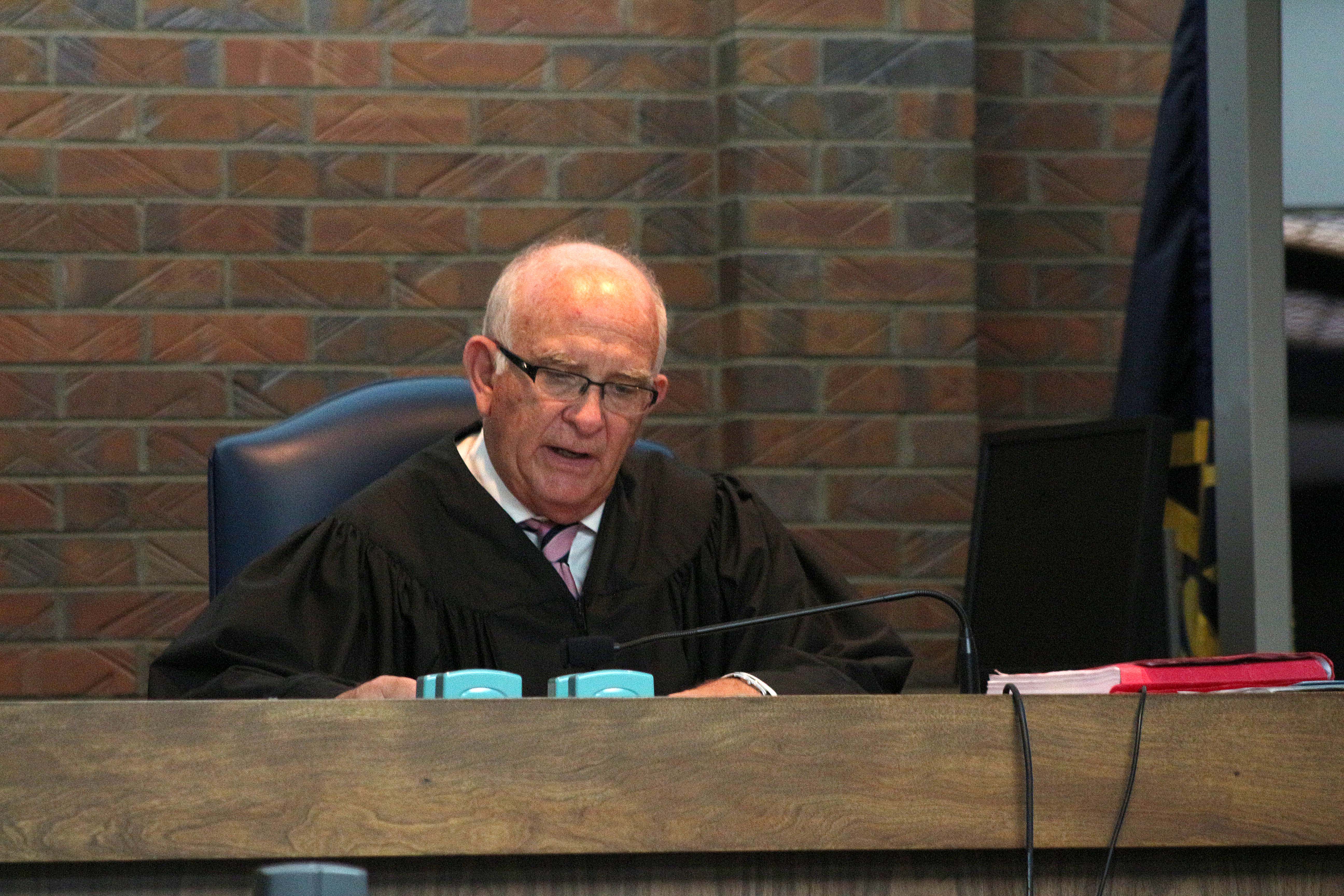 Franklin County District Judge Thomas H. Sachse hears the case of Kyle T. Flack, 27, of Ottawa, charged in May with the killings of three adults and one 18-month-old child. On Monday, Sachse refused to issue a blanket order sealing all documents in the case, and scheduled a pretrial process that will continue for at least seven months. Bobby Burch/The Ottawa Herald