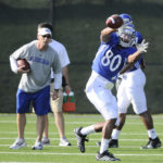 Under the watchful eyes of then-Kansas University receivers coach David Beaty, left, Dezmon Briscoe pulls in a pass during practice in this photo from Aug. 11, 2009. Briscoe is among those glad Beaty is returning to KU — as head coach.