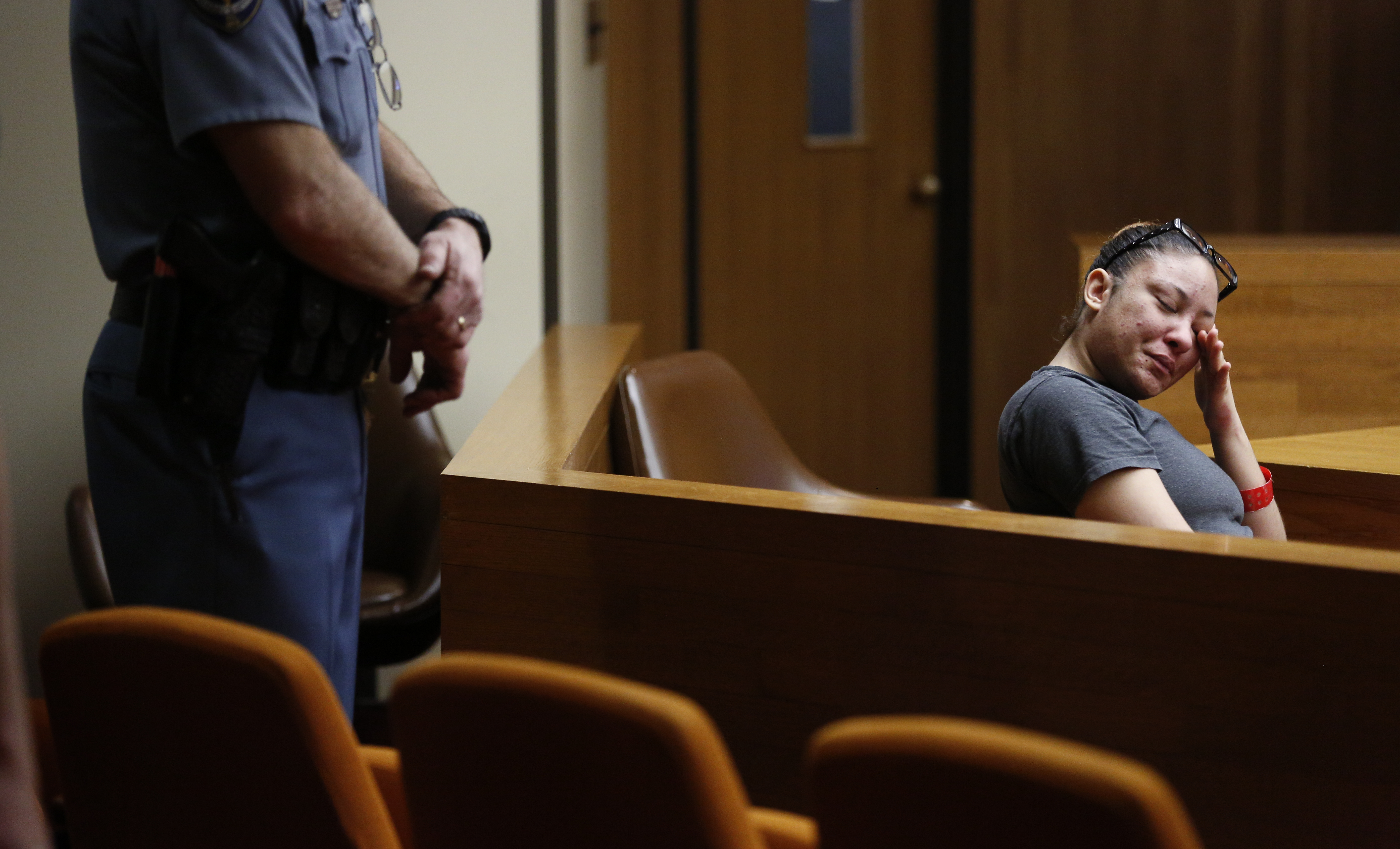 Brittny Adams, of Topeka, wipes away tears as Jeremy Edens, son of homicide victim Gary Edens, 51, testifies about the moment he realized that his father had been shot during an alleged confrontation with Adams and Jonathan R. Rush July 17, 2013, at Gary Edens' home at 647 N. Michigan St., at a hearing Wednesday in Douglas County District Court. Adams now faces a charge of first-degree murder.