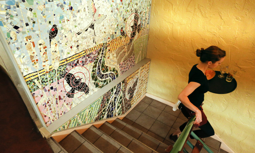 Free State Brewing Co. server Elizabeth Cunningham makes her way down the stairs past a mosaic created by Lawrence artist Lora Jost.