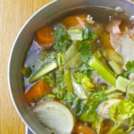 A basic stock is often the most beautiful thing in a chef’s repertoire and the key element of soup. The soul of an efficient kitchen rests in the flavors of an easier-than-you-think broth. Composting is great, but how many of those veggie scraps could be used for stock? Keep a container of stock scraps in your freezer and always save bones.