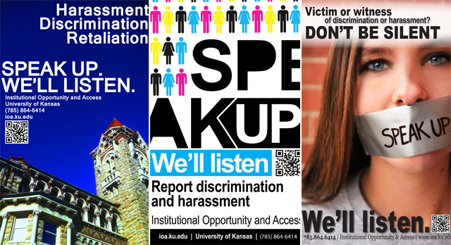 Three Office of Institutional Opportunity and Access posters encouraging Kansas University students to report discrimination and harassment are shown in this composite image.
