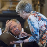 Sen. Marci Francisco, D-Lawrence, right, discusses tax issues with Sen. Jim Denning, R-Overland Park, on the floor of the Kansas Senate Tuesday, June 2, 2015, in Topeka.