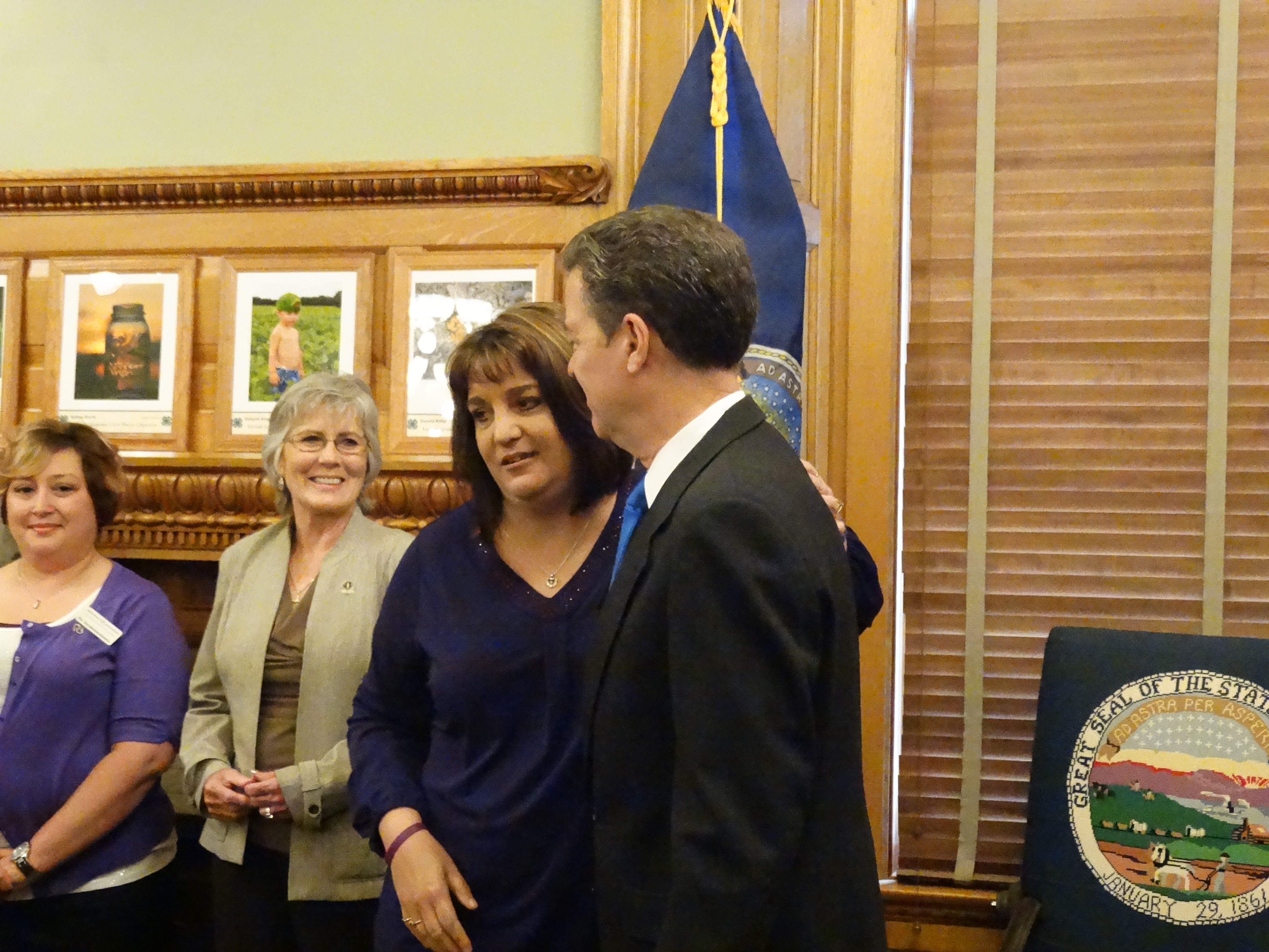 Jennifer Nauertc, daughter of former Lawrence High School football coach Bill Freeman, thanks Gov. Sam Brownback for signing a bill authorizing the sale of distinctive Alzheimer's disease awareness license plate. Freeman died from complications of Alzheimer's in December.