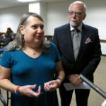 Stephanie Mott, left, a transgender Topeka woman and activist, and Pedro Irigonegaray, right, her attorney, speak to reporters following a state health department hearing on regulatory changes that would make it more difficult to change the gender listed on a person’s birth certificate, Thursday, May 12, 2016, in Topeka, Kan. Mott predicts the changes will cause more transgender youth to attempt suicide and has told state officials, These