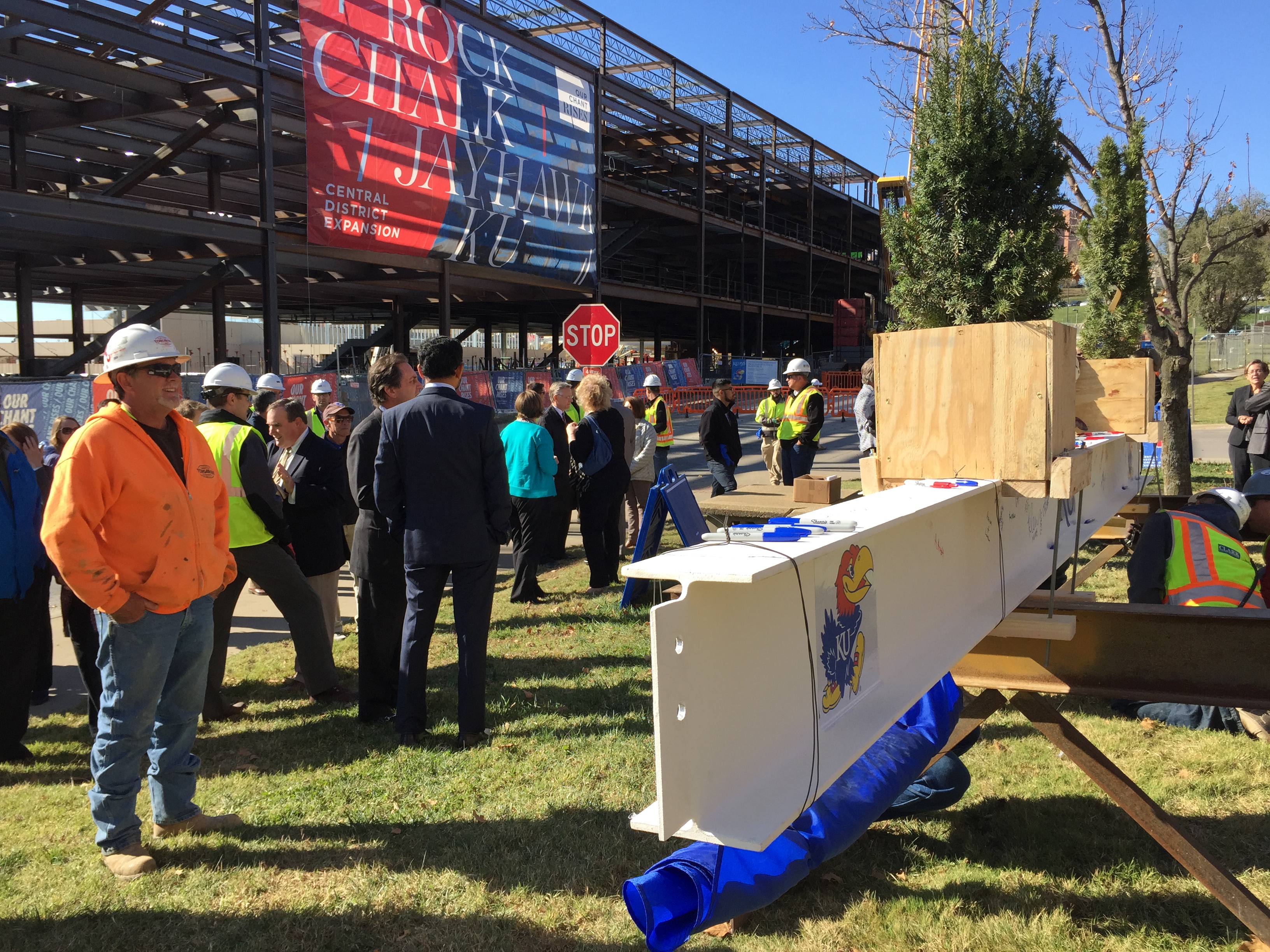 KU planned the event to celebrate a construction milestone — the “topping out” ceremony, in which the final beam is hoisted — for its new $117 million Integrated Science Building, considered the keystone of the university’s $350 million Central District redevelopment project.