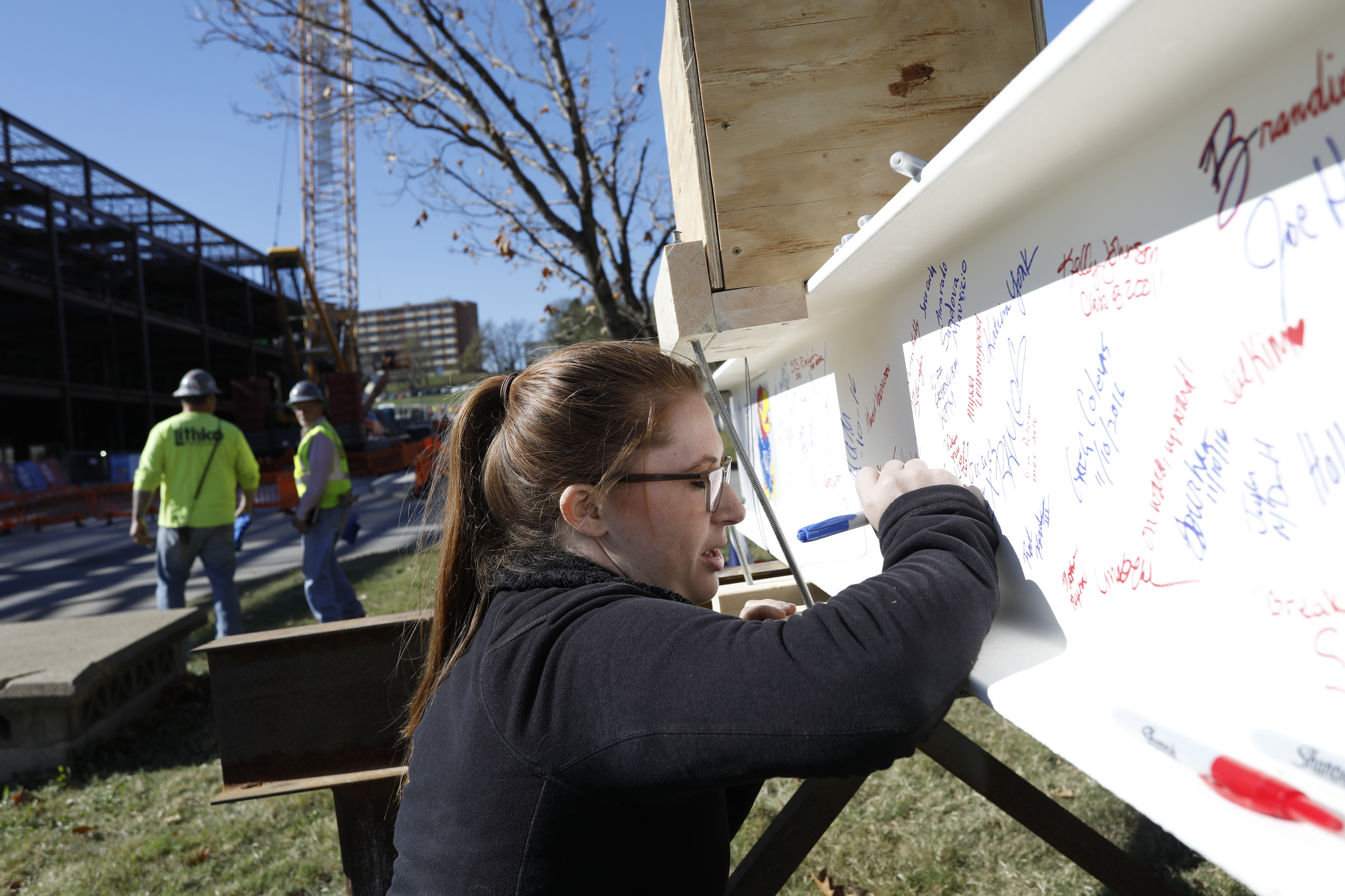 University of Kansas senior Laura Furney, of Wamego, signs a special beam to be hoisted to the top of KU's new Integrated Science Building to celebrate the university's Central District project, Thursday, Nov. 10, 2016.