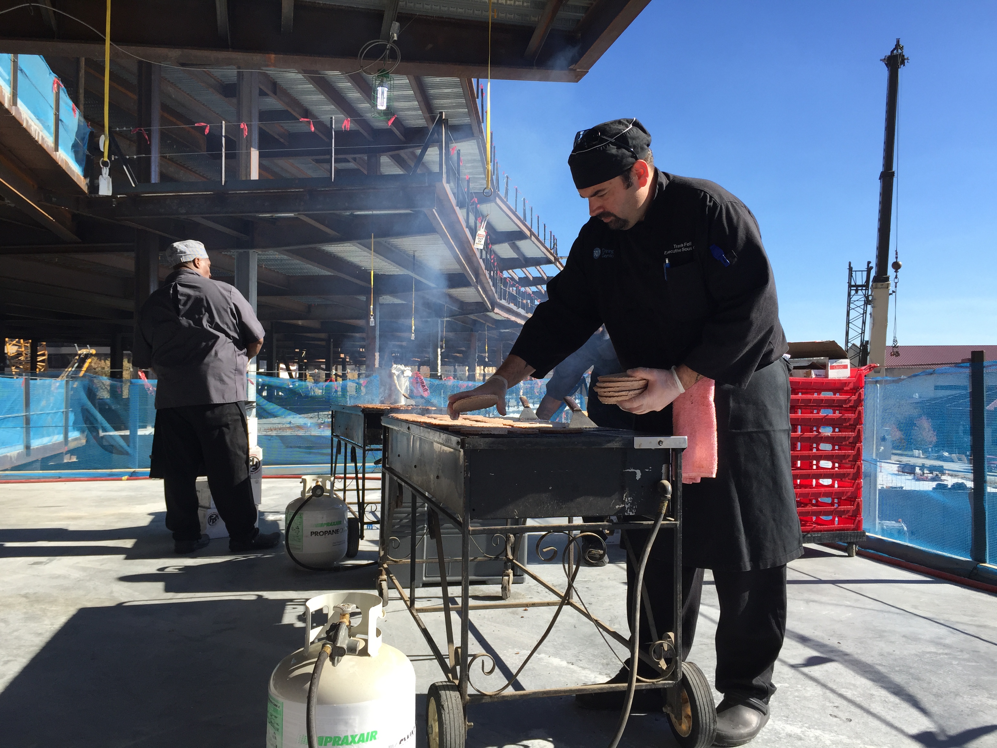 KU Dining Services employees grill hamburgers in plein air in the under-construction Integrated Science Building in KU's Central District on Thursday, Nov. 10, 2016. More than 300 construction workers and other stakeholders gathered for lunch and a topping