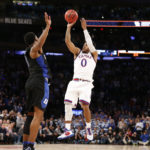 Kansas guard Frank Mason III (0) puts up the final shot over Duke guard Matt Jones (13) with seconds remaining for the win on Tuesday, Nov. 15, 2016 at Madison Square Garden in New York.