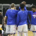The Kansas guards come together in a huddle prior to tipoff against Missouri for the Showdown for Relief exhibition, Sunday, Oct. 22, 2017 at Sprint Center in Kansas City, Missouri.