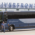 The 1:55 p.m. Greyhound bus headed to Topeka and southwest to Dallas, drops off a passenger Tuesday, July 5, 2016 at the bus stop between City Hall and the Riverfront.