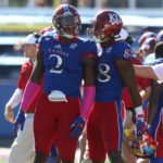 Kansas defensive end Dorance Armstrong Jr. (2) celebrates with Kansas wide receiver Jeremiah Booker (88) after Armstrong forced a fumble during the first quarter on Saturday, Oct. 8, 2016 at Memorial Stadium.