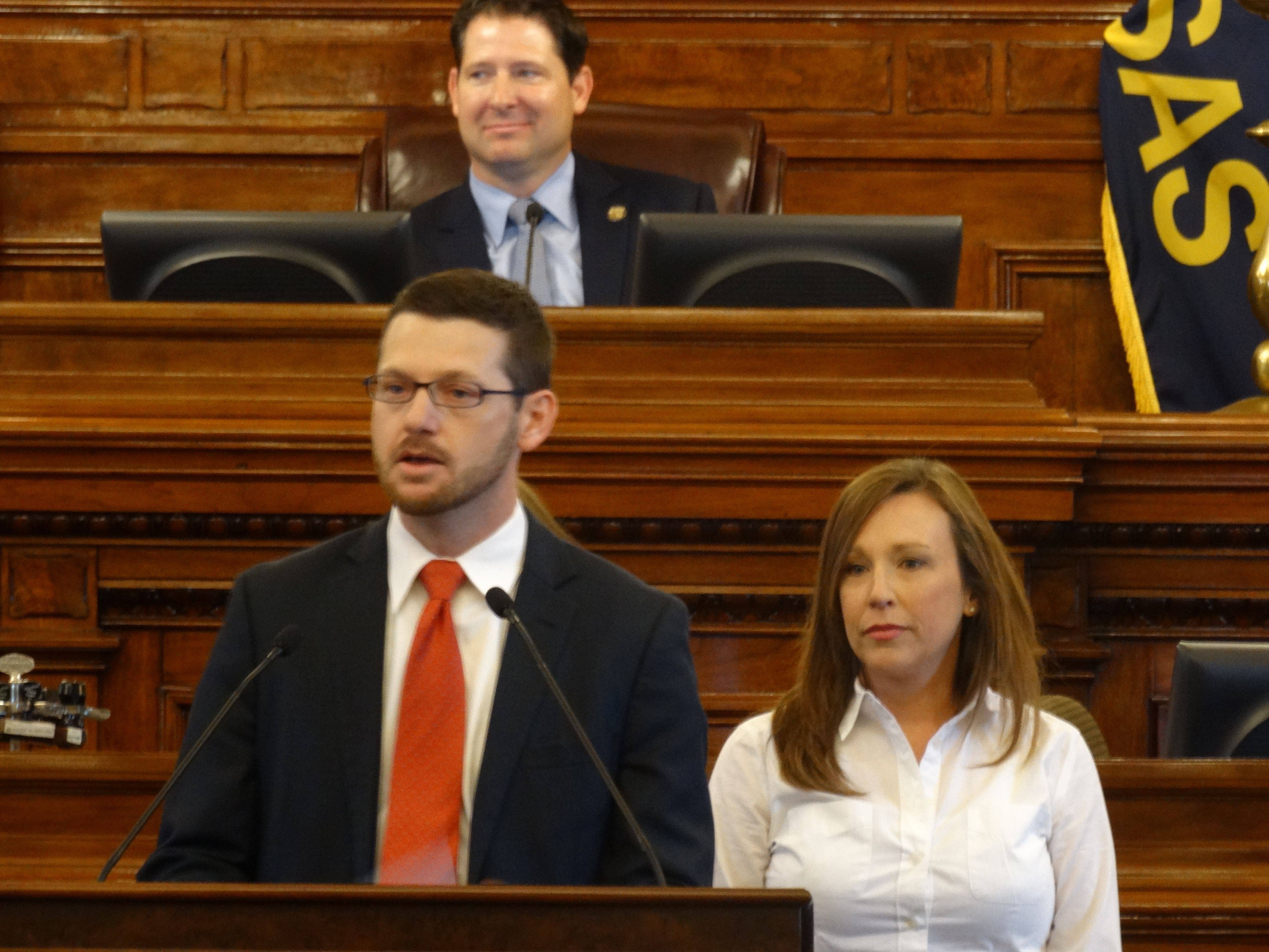 State Rep. John Wilson, D-Lawrence, stands with his wife, Jami Jones, on the House floor to announce his resignation from the 10th District House seat on June 26, 2017.