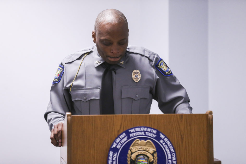 In an emotional moment, Lawrence police chief Gregory Burns Jr. acknowledges being grateful for the opportunity to lead the LPD following his swearing in ceremony on Monday, Oct. 2, 2017 at the Lawrence Police Department Investigations Center, 4820 Bob Billings Parkway. Burns formerly served as the assistant police chief in the Louisville, Ky., Metro Police Department.
