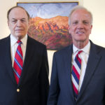 U.S. Sen. Richard Shelby, R-Ala., left, and Sen. Jerry Moran, R-Kan., chairman of the Subcommittee on Consumer Protection, Product Safety, Insurance, and Data Security, pose for a photo after speaking to the Associated Press in the U.S. Embassy in Moscow, Russia, Wednesday, July 4, 2018. A U.S. senator who is part of a congressional delegation visiting Russia says Moscow could help improve ties by not meddling in the midterm U.S. election in November. (AP Photo/Maria Danilova)