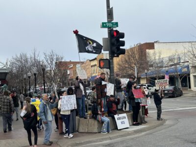 Approximately 100 people gathered in downtown Lawrence Tuesday afternoon to protest the Trump administration and actions of U.S. Immigration and Customs Enforcement.