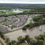 This Monday, Sept. 3, 2018, aerial photo taken with a drone and provided by the Riley County Department shows flooding near a residential area in Manhattan, Kan. Heavy rain caused a creek to burst its banks and flood the Kansas college town, forcing more than 300 people to evacuate their homes, including some who were ferried to dry land in boats. (Doug Wood/Riley County Police Department via AP)