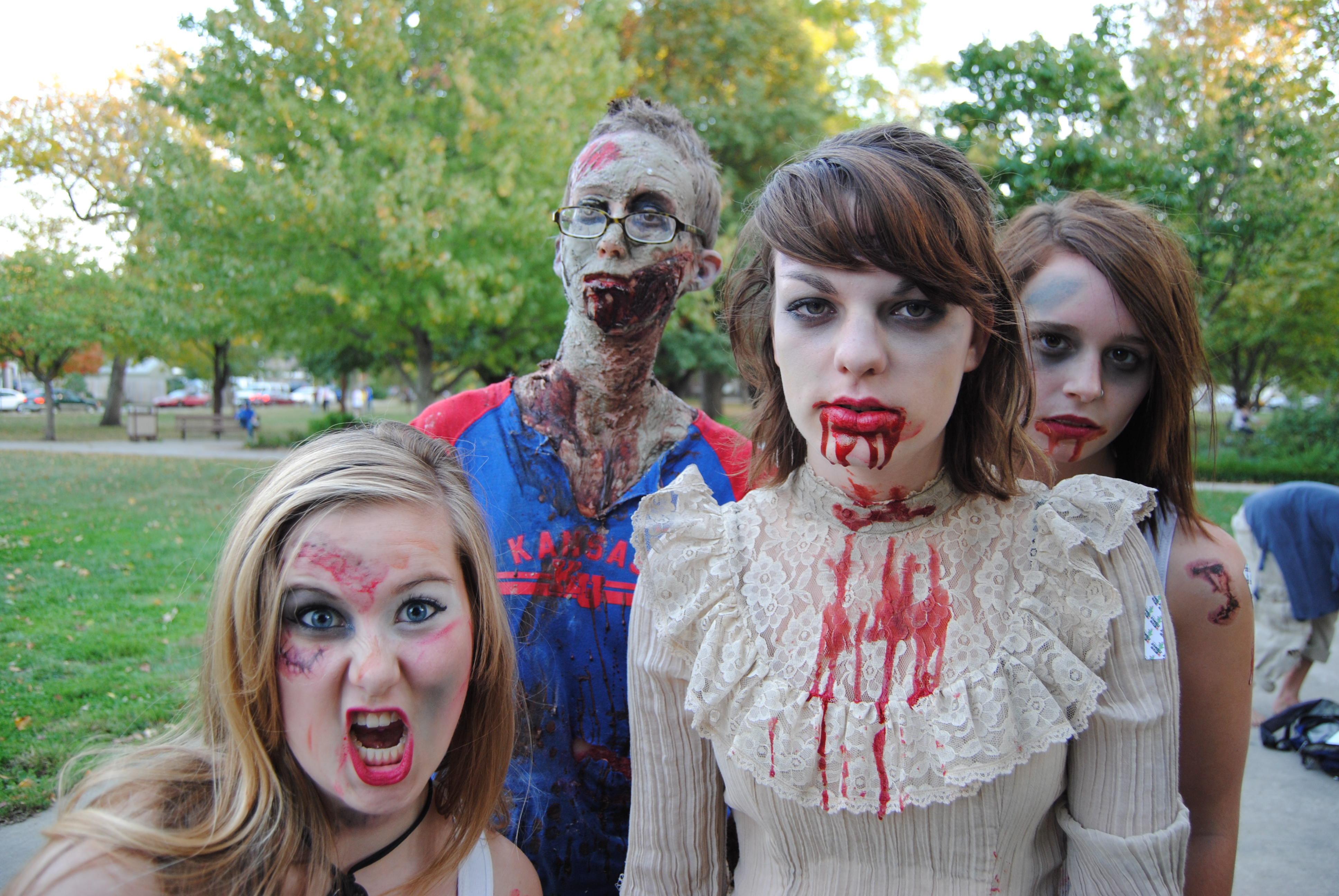 A trio of zombies wait for the start of the zombie walk in South Park before the fifth annual Lawrence Zombie Walk Thursday, Oct. 6, 2011. Over 500 people attended the walk with money raised from the event going to the Lawrence Humane Society.