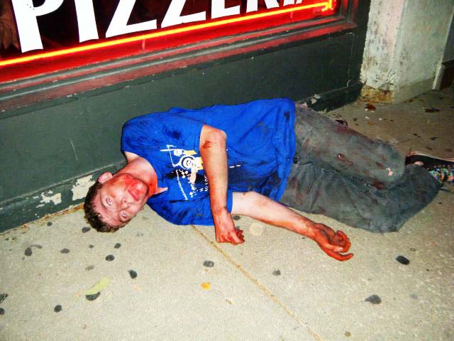 A zombie casualty hits the pavement in the 700 block of Massachusetts Street during the fifth annual Lawrence Zombie Walk.
