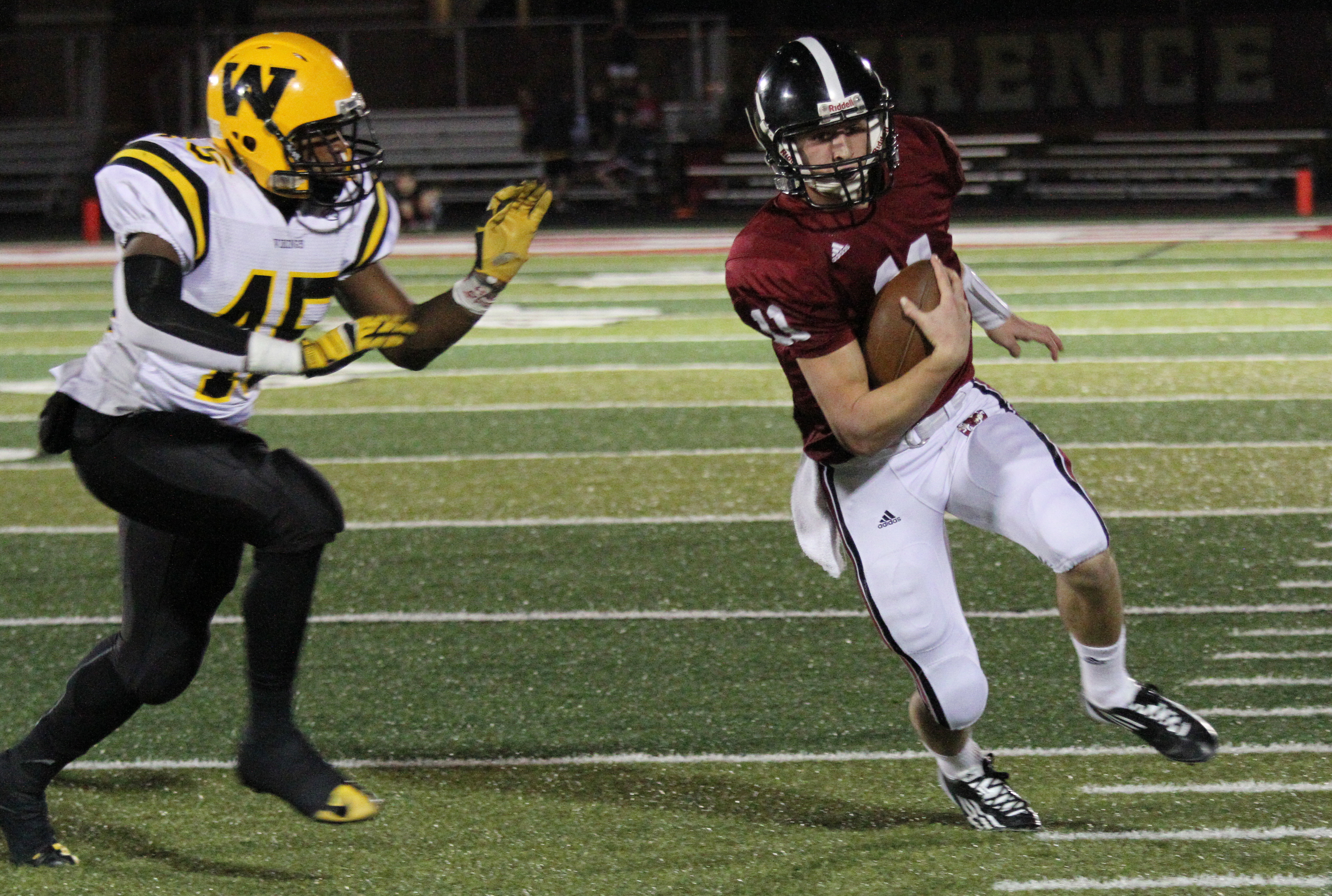 Quarterback Brad Strauss (11) tries to turn the corner and run the sidelines against Shawnee Mission defender Rashaun Owens (45) during the Lawrence Lions 21-14 loss to Shawnee Mission West in a 6A regional playoff game at LHS Friday night.