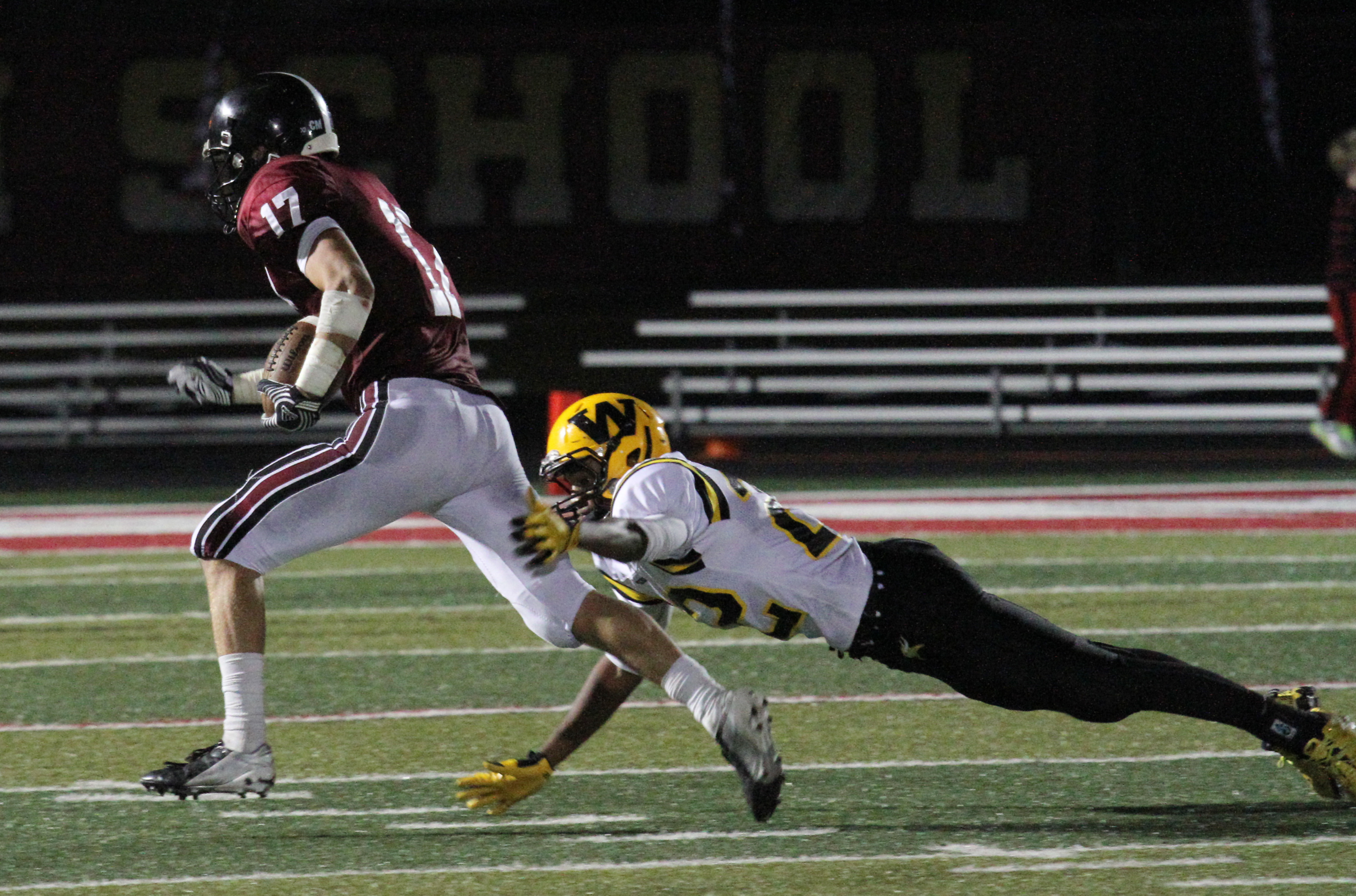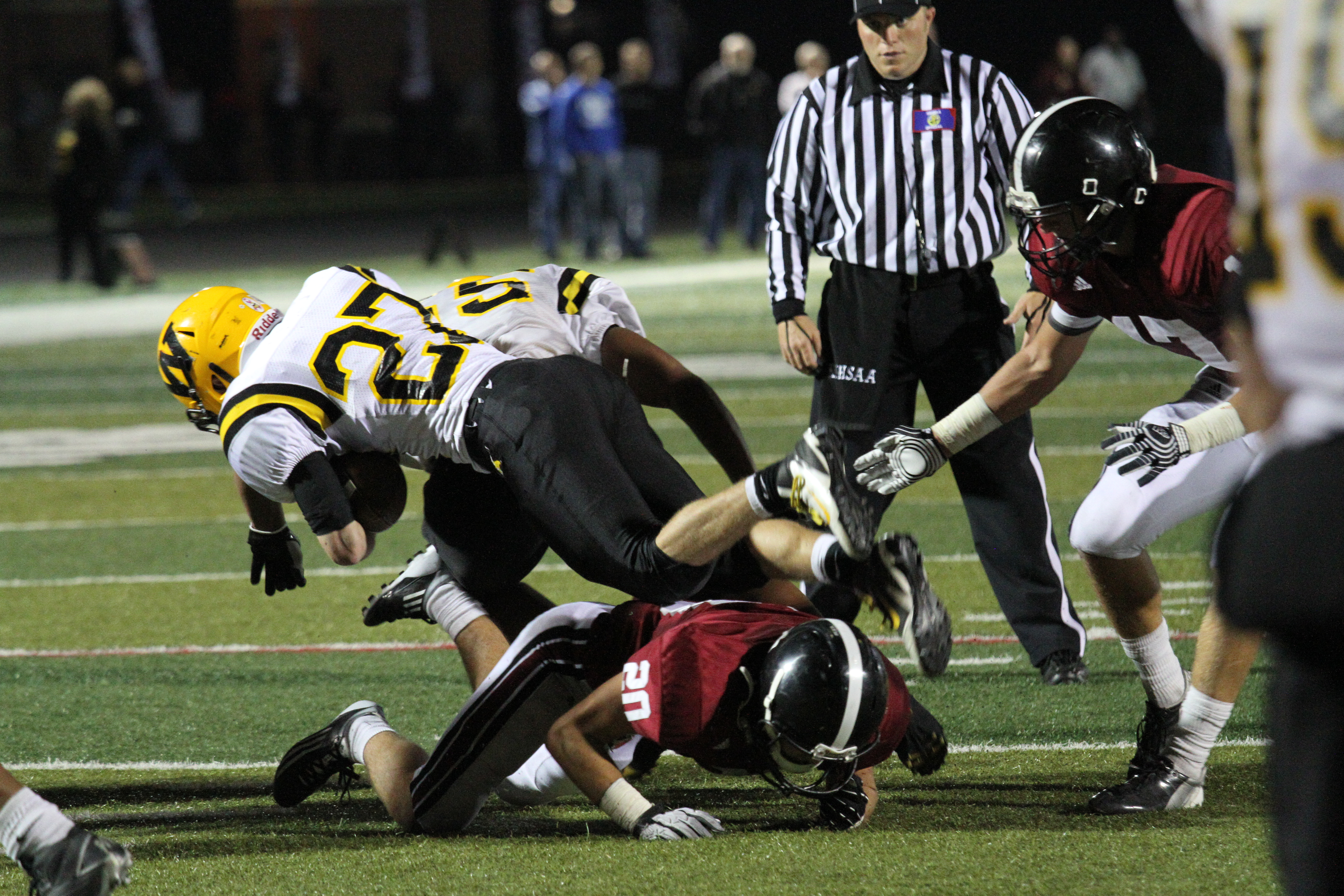 Will Thompson (20) puts a low tackle on Wests Brett Sterbah in the Lawrence Lions 21-14 loss to Shawnee Mission West in a 6A regional playoff game at LHS Friday night.