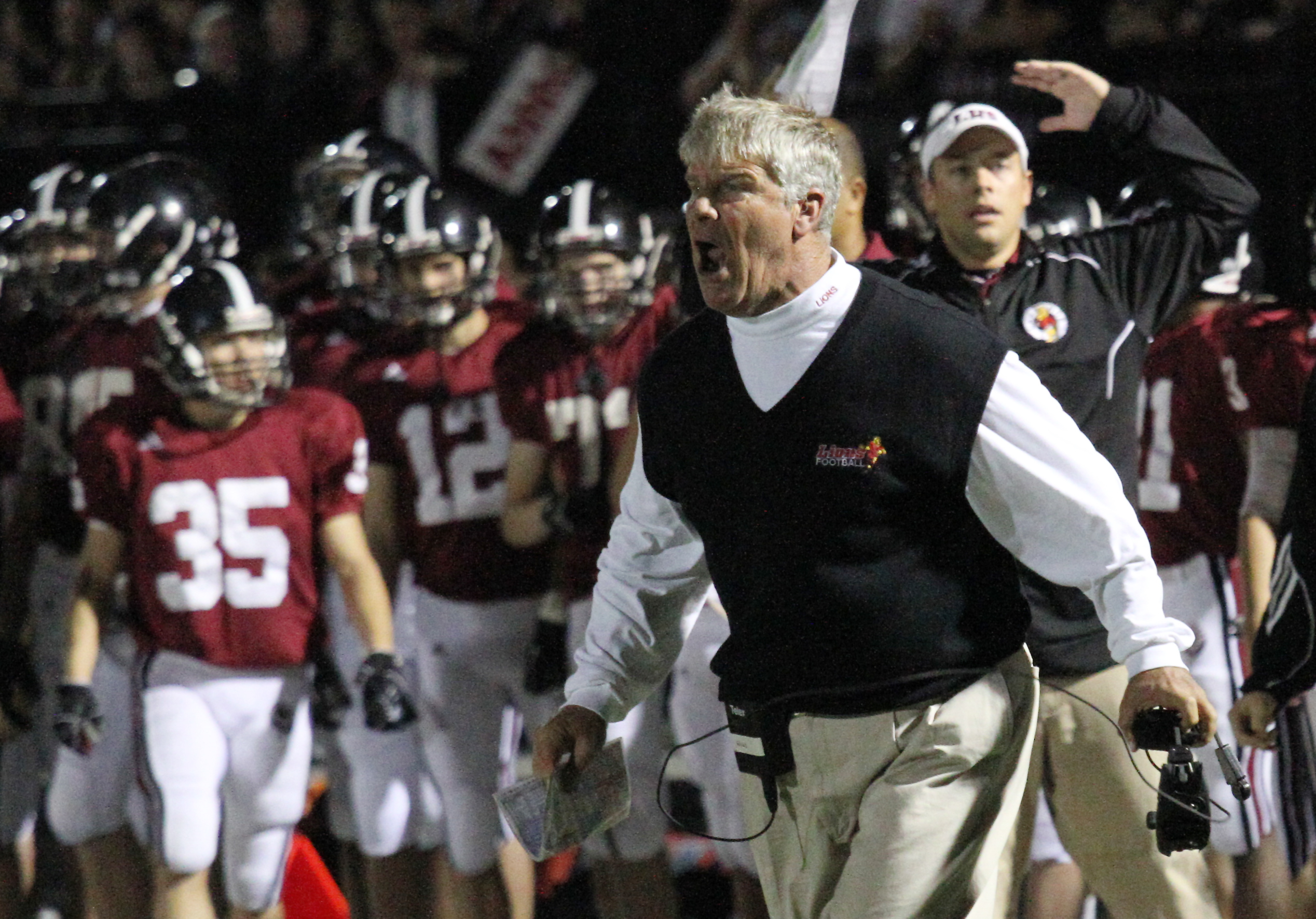 Lions coach Dirk Wedd argues a call with the referees during the Lawrence Lions 21-14 loss to Shawnee Mission West in a 6A regional playoff game at LHS Friday night.