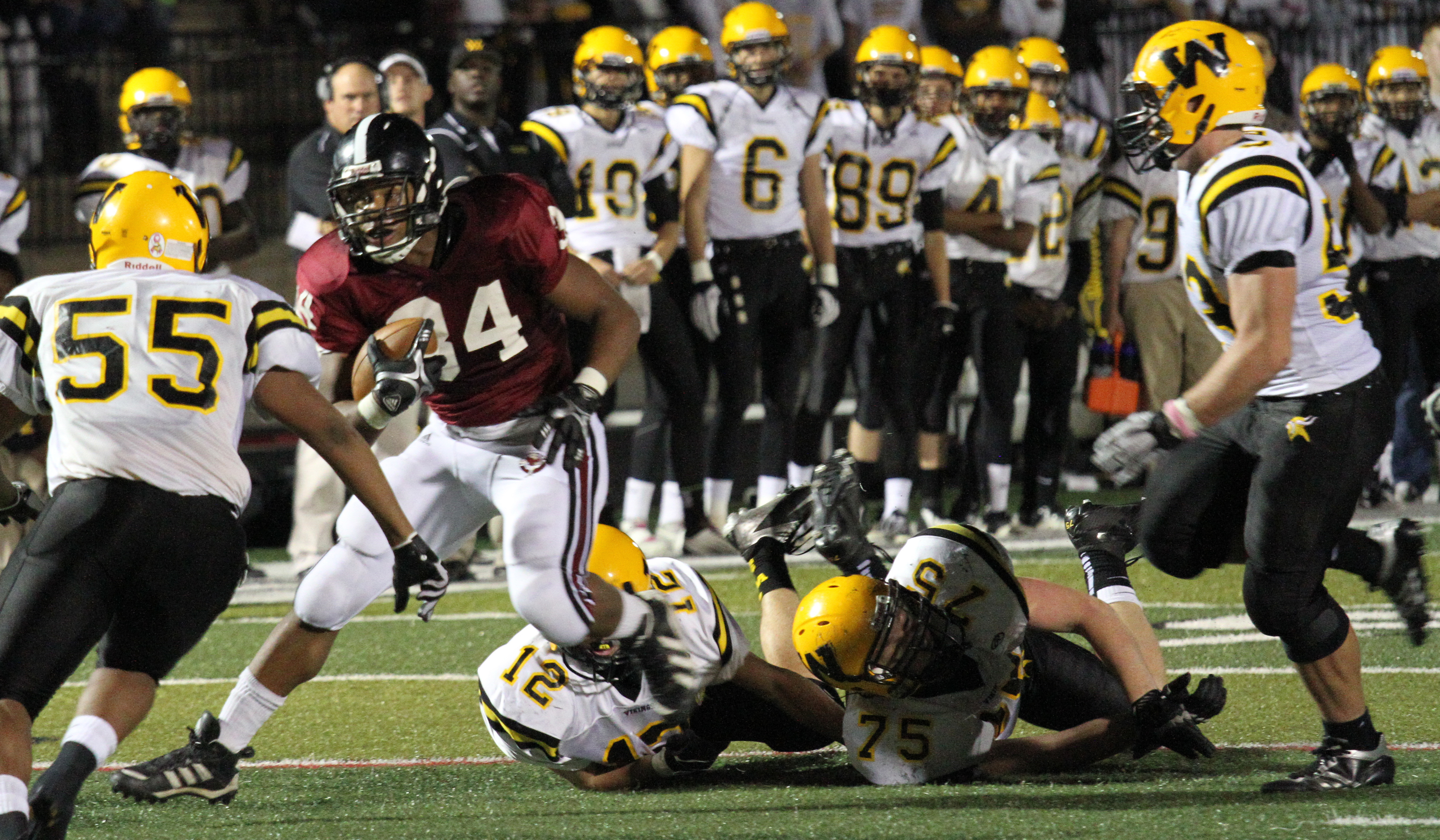 Tyrone Jenkins (34) rusher for yards in the Lawrence Lions 21-14 loss to Shawnee Mission West in a 6A regional playoff game at LHS Friday night.