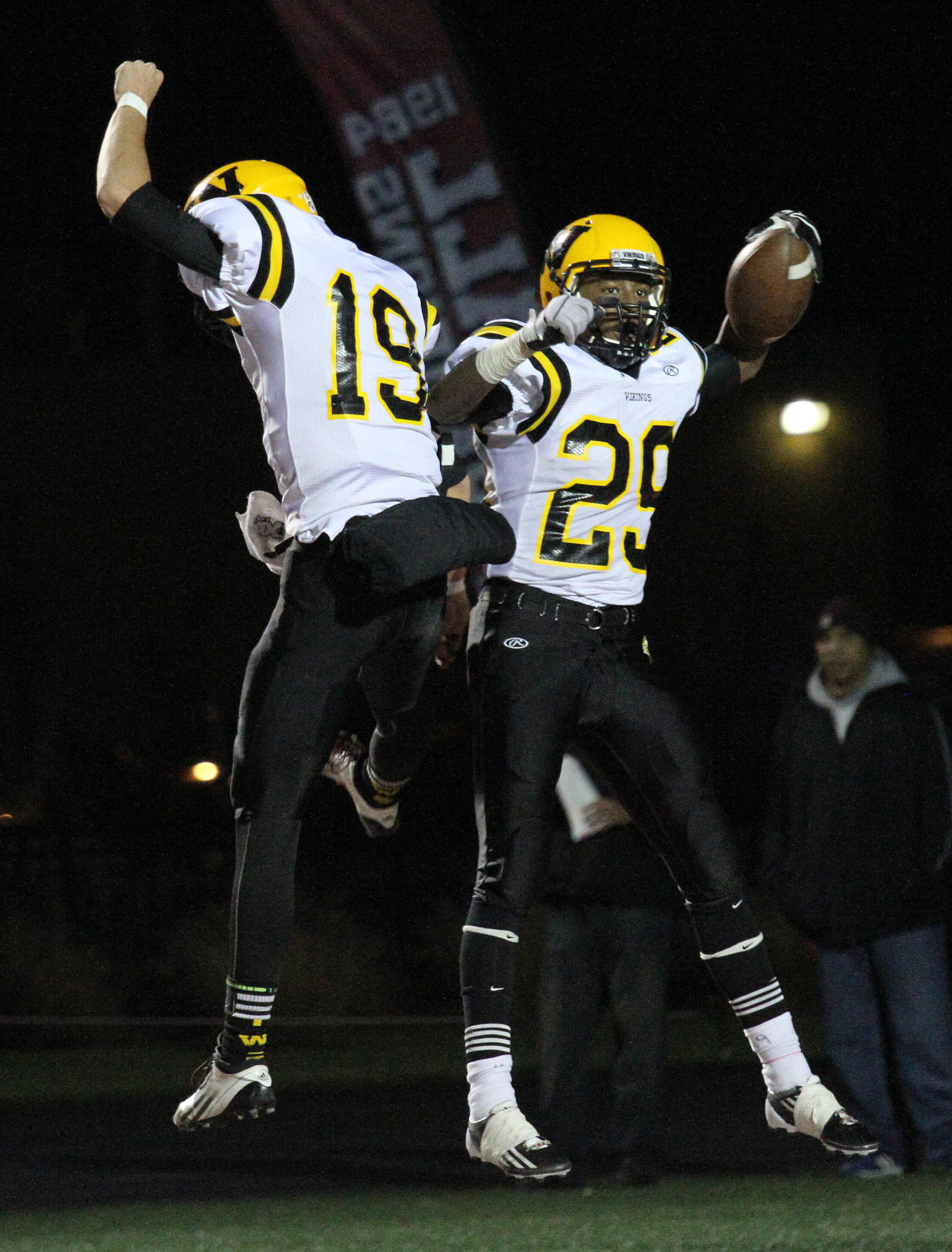 Shawnee Mission Wests AJ Verdini (19) and Andre Maloney (29) celebrate a 3rd quarter touchdown against the Lawrence Lions in a Lions 21-14 loss to West in a 6A regional playoff game at LHS Friday night.