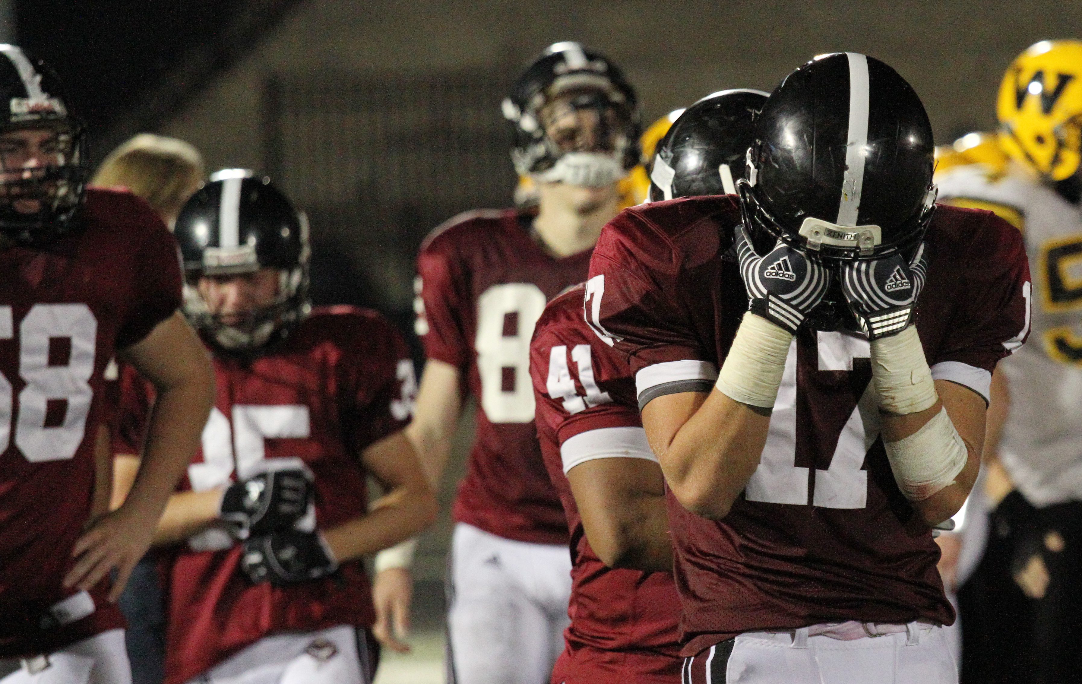 Drake Hofer, (17) feels the pain of a loss for the Lawrence Lions in a 21-14 defeat to Shawnee Mission West in a 6A regional playoff game at LHS Friday night.