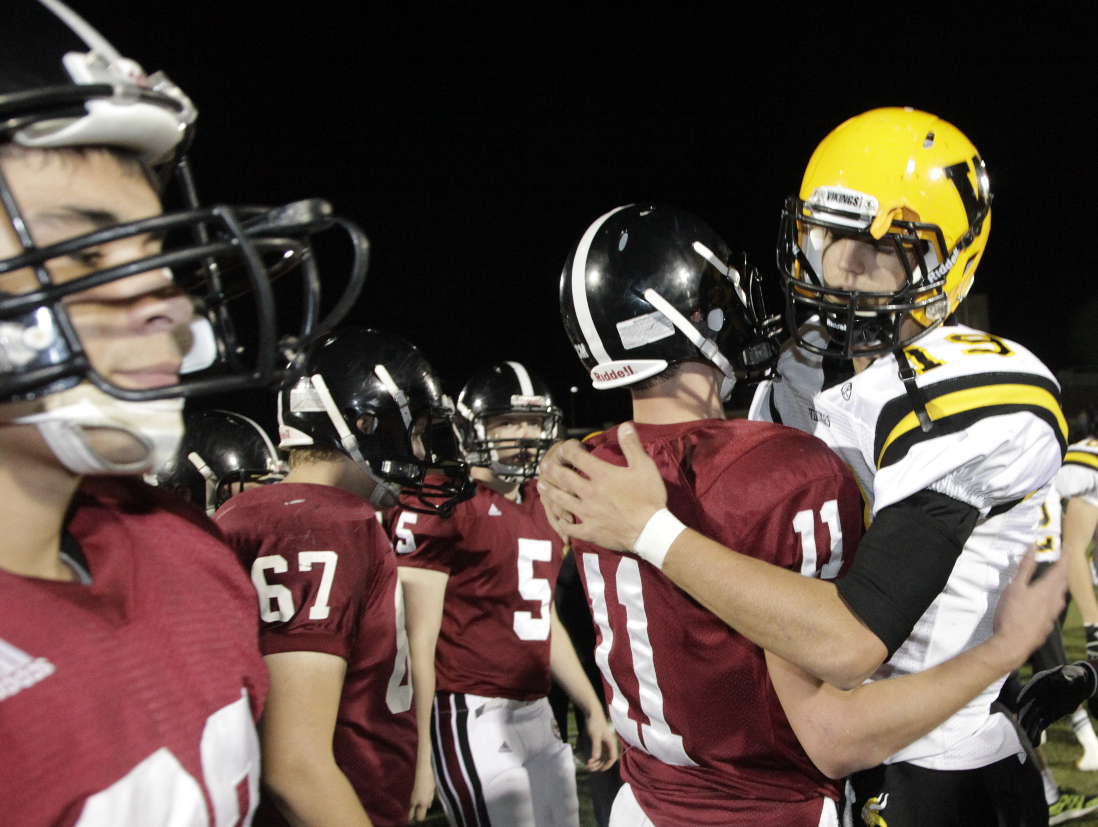 Lions quarterback Brad Strauss, (11) left and Shawnee Mission West quarterback AJ Verdini (19) congratulate each other after the Lions 21-14 loss to Shawnee Mission West in a 6A regional playoff game at LHS Friday night.