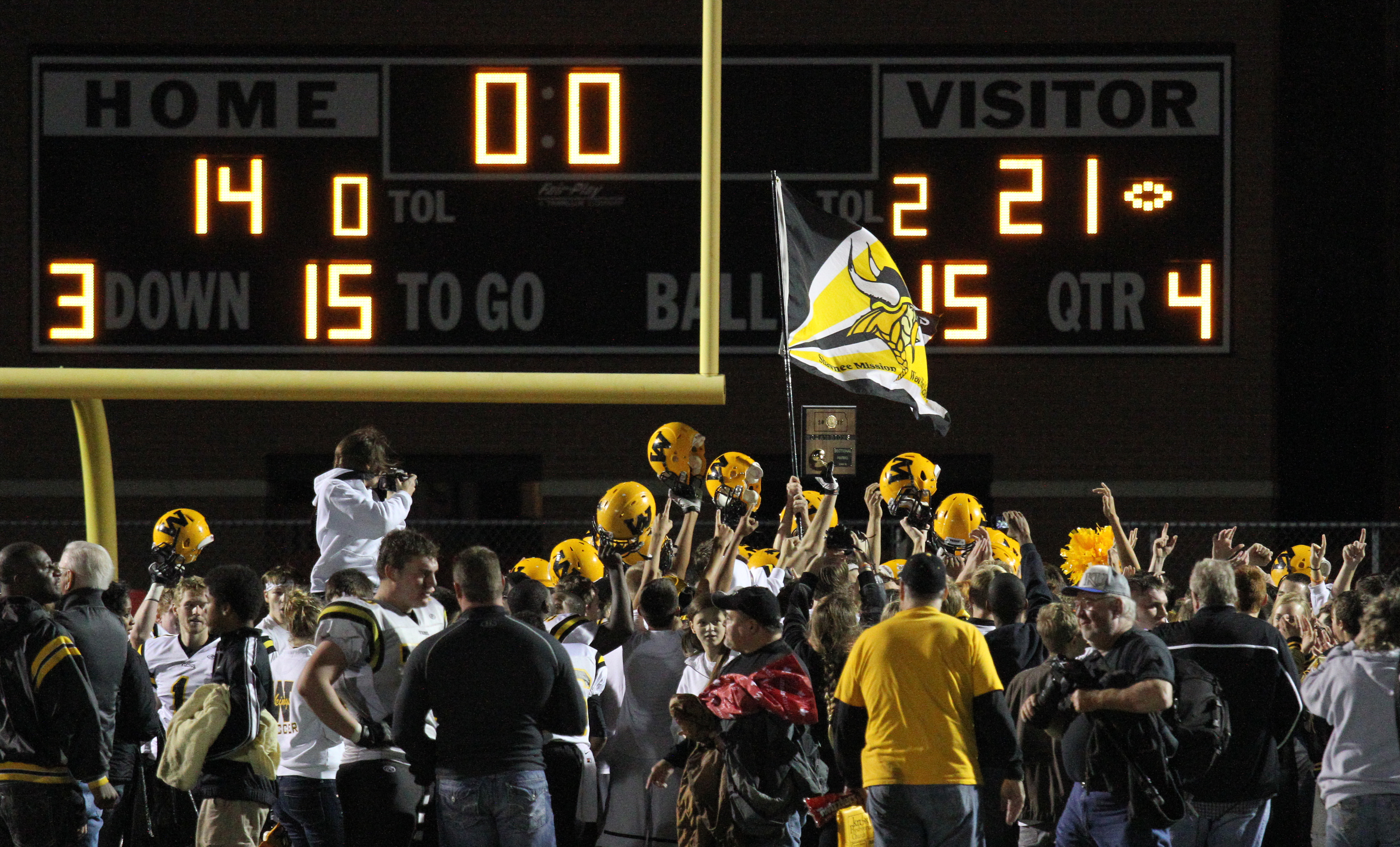 The Shawnee Mission West team and fans celebrate on the Lawrence High School field after defeating the Lawrence Lions 21-14 in a 6A regional playoff game at LHS Friday night.