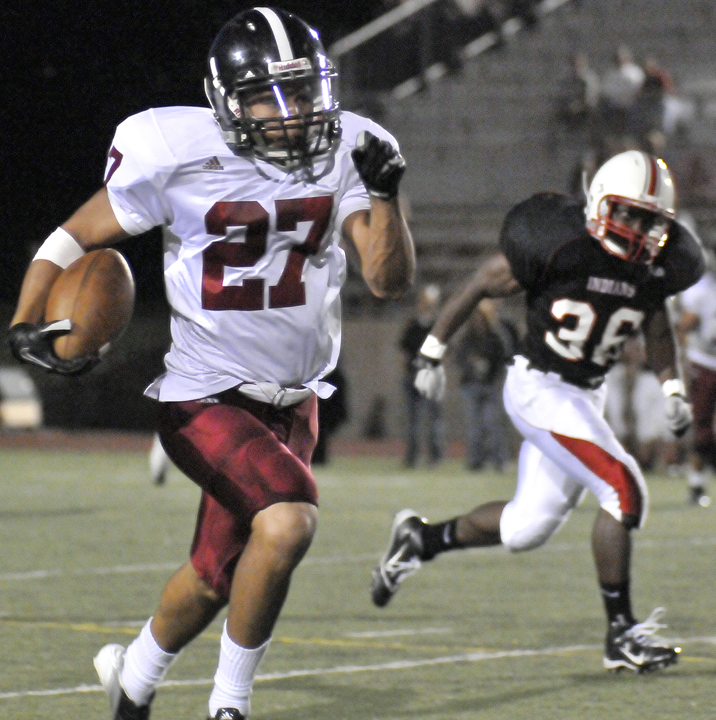 Lawrence receiver Eric Mayo (27) takes off for the end zone in the second half to score Friday, Sept. 21, 2012, at the SM North District Complex.