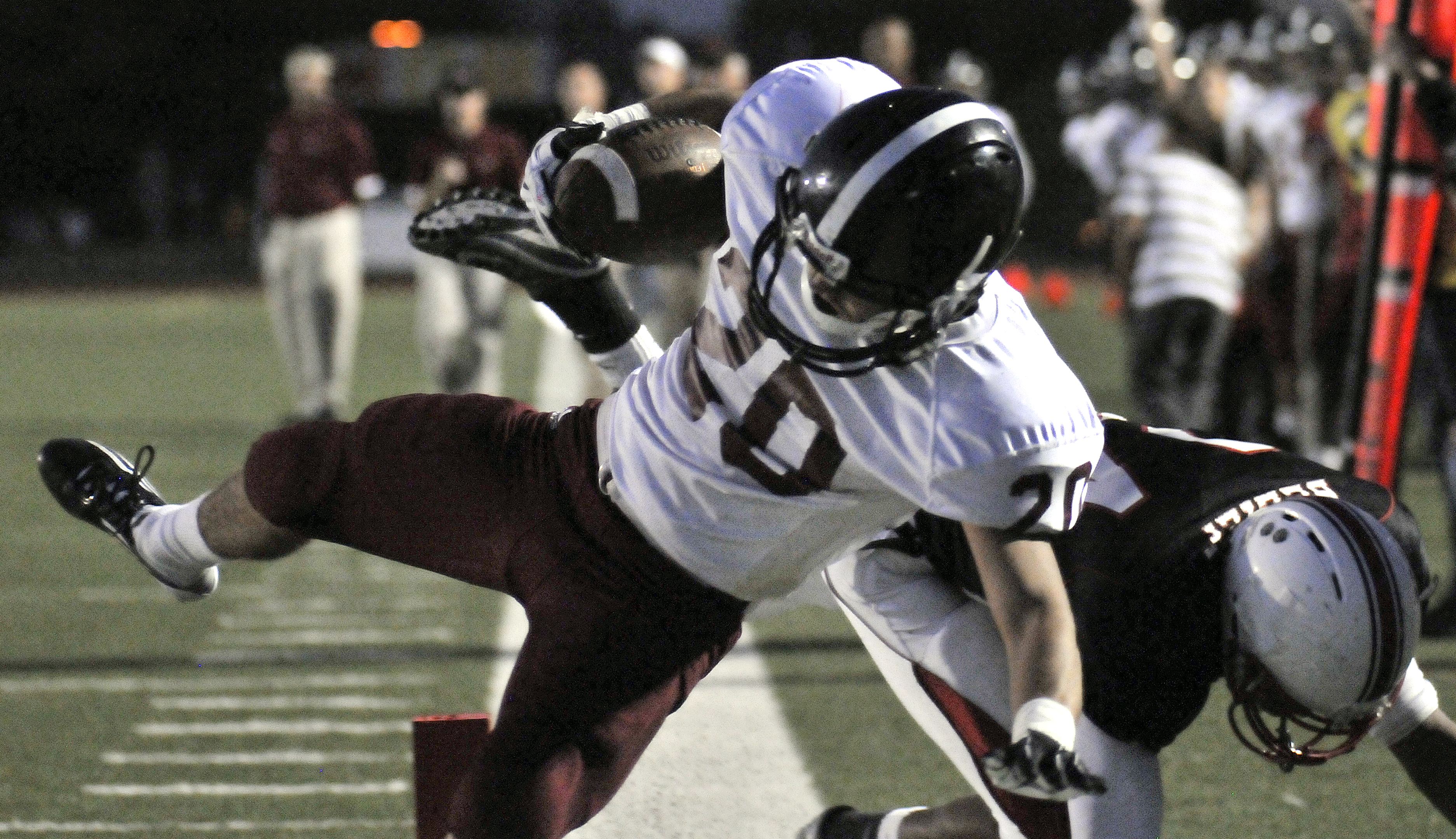 Lawrence wide receiver Will Thompson is knocked out of bounds after a touchdown catch in the first half Friday, Sept. 21, 2012, at the SM North District Complex.